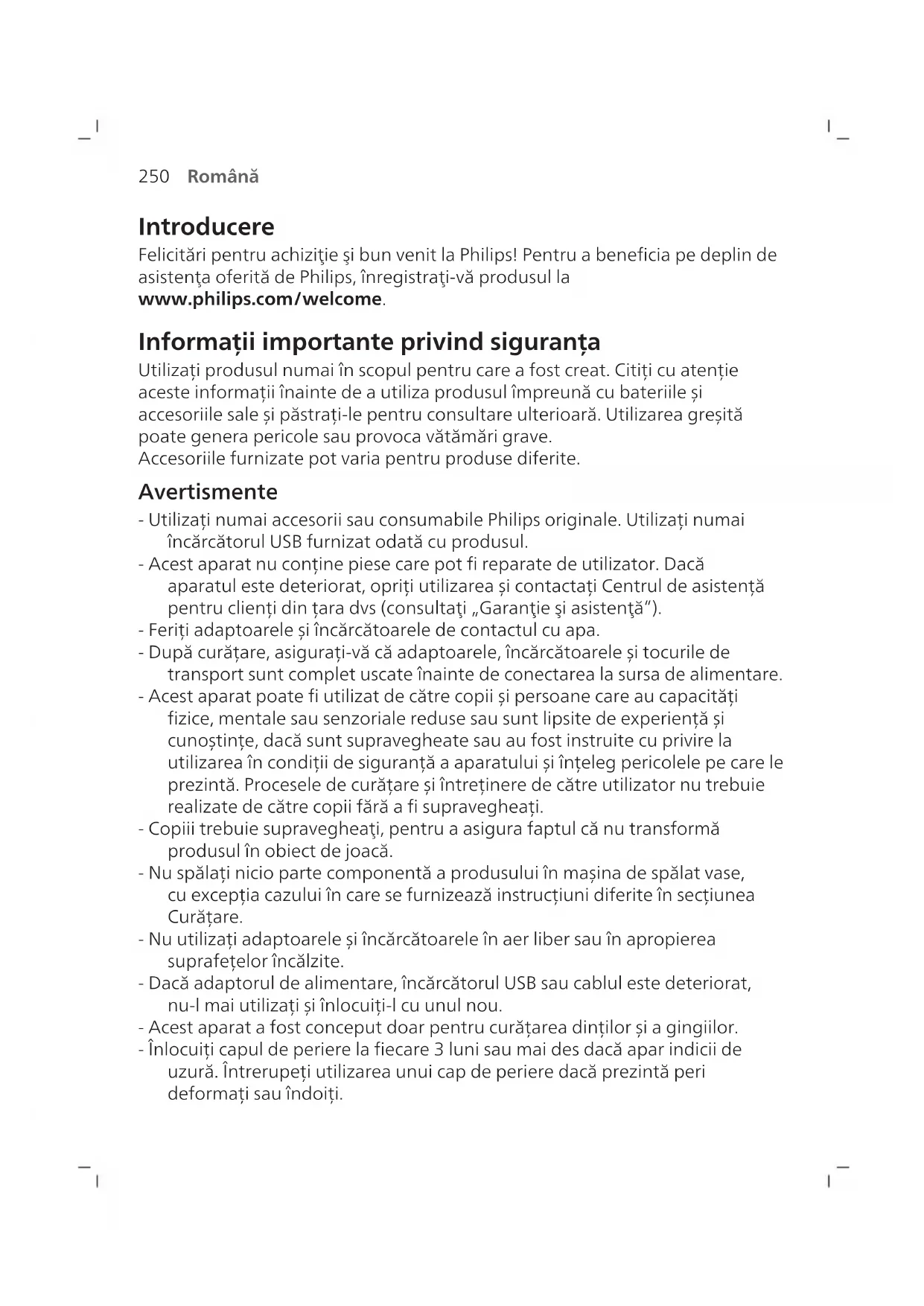 Română Introducere Felicitări pentru achiziţie şi bun venit la Philips! Pentru a beneficia pe deplin de asistenţa oferită de Philips, înregistraţi-vă produsul la www.philips.com/welcome. Informații importante privind siguranța Utilizați produsul numai în scopul pentru care a fost creat. Citiți cu atenție aceste informații înainte de a utiliza produsul împreună cu bateriile și accesoriile sale și păstrați-le pentru consultare ulterioară. Utilizarea greșită poate genera pericole sau provoca vătămări grave. Accesoriile furnizate pot varia pentru produse diferite. Avertismente - Utilizați numai accesorii sau consumabile Philips originale. Utilizați numai încărcătorul USB furnizat odată cu produsul. - Acest aparat nu conține piese care pot fi reparate de utilizator. Dacă aparatul este deteriorat, opriți utilizarea și contactați Centrul de asistență pentru clienți din țara dvs (consultaţi „Garanţie şi asistenţă”). - Feriți adaptoarele și încărcătoarele de contactul cu apa. - După curățare, asigurați-vă că adaptoarele, încărcătoarele și tocurile de transport sunt complet uscate înainte de conectarea la sursa de alimentare. - Acest aparat poate fi utilizat de către copii și persoane care au capacități fizice, mentale sau senzoriale reduse sau sunt lipsite de experiență și cunoștințe, dacă sunt supravegheate sau au fost instruite cu privire la utilizarea în condiții de siguranță a aparatului și înțeleg pericolele pe care le prezintă. Procesele de curățare și întreținere de către utilizator nu trebuie realizate de către copii fără a fi supravegheați. - Copiii trebuie supravegheaţi, pentru a asigura faptul că nu transformă produsul în obiect de joacă. - Nu spălați nicio parte componentă a produsului în mașina de spălat vase, cu excepția cazului în care se furnizează instrucțiuni diferite în secțiunea Curățare. - Nu utilizați adaptoarele și încărcătoarele în aer liber sau în apropierea suprafețelor încălzite. - Dacă adaptorul de alimentare, încărcătorul USB sau cablul este deteriorat, nu-l mai utilizați și înlocuiți-l cu unul nou. - Acest aparat a fost conceput doar pentru curățarea dinților și a gingiilor. - Înlocuiți capul de periere la fiecare 3 luni sau mai des dacă apar indicii de uzură. Întrerupeți utilizarea unui cap de periere dacă prezintă peri deformați sau îndoiți.251 Română - Clătiți periuța, în special conexiunea capului de periere. Curățați în mod delicat în jurul garniturii din cauciuc. - Asigurați-vă că capul de periere și periuța de dinți sunt uscate înainte de a fi depozitate în tocul de transport. - Evitaţi contactul direct cu produse care conţin uleiuri esenţiale sau ulei de cocos. Contactul poate conduce la dislocarea perilor. - Altitudinea maximă de utilizare este de 4.500 de metri. - Informațiile despre substanțele REACH, prezente în produsele Philips, pot fi găsite la adresa www.philips.com/REACH Avertismente medicale - Opriți utilizarea aparatului și consultați stomatologul/medicul dacă apar sângerări excesive sau prelungite după utilizare sau dacă prezentați disconfort sau durere în timpul utilizării. - Dacă aveți un stimulator cardiac sau alte dispozitive implantate, contactați medicul sau producătorul dispozitivului implantat, înainte de utilizare. - Acest aparat este un dispozitiv de îngrijire personală și nu este destinat să fie folosit în comun de mai mulți utilizatori. Instrucțiuni de siguranță pentru baterii - Acest aparat conține baterii care pot fi demontate numai de către persoane calificate. - Ferește produsul și bateriile de foc și nu le expune la lumina directă a soarelui sau la temperaturi ridicate. - Dacă produsul se încălzește în mod anormal, emană un miros anormal, își schimbă culoarea sau dacă încărcarea sa durează mai mult decât de obicei, încetați utilizarea și încărcarea produsului și contactați Philips. - Nu așezați produsele și bateriile acestora în cuptoare cu microunde sau pe mașinile de gătit cu inducție. - Nu deschide, modifica, perfora, deteriora sau demonta produsul sau bateria pentru a preveni încălzirea bateriilor și eliberarea de substanțe toxice sau periculoase. Nu scurtcircuita, supraîncărca sau încărca invers bateriile. - Acest aparat conţine baterii care nu se pot înlocui. Când bateria a ajuns la sfârșitul duratei de utilizare, aparatul trebuie eliminat corespunzător, consultați secțiunea referitoare la Reciclare. - Încărcați numai cu Philips WAA1001, WAA2001, adaptoare IPX4 aprobate pentru siguranță cu valori nominale de intrare (100‑240V~; 50/60Hz; 3,5W) și de ieșire (5Vc.c.; 2,5W). Pentru lista de adaptoare, consultați www.philips.com/support. - Încărcați și utilizați produsul la o temperatură cuprinsă între 0 °C și 40 °C.252 Română Condiții de depozitare și transport Temperatură cuprinsă între -20°C și +60°C. Câmpuri electromagnetice (EMF) Acest aparat Philips respectă toate standardele şi reglementările aplicabile privind expunerea la câmpuri electromagnetice.