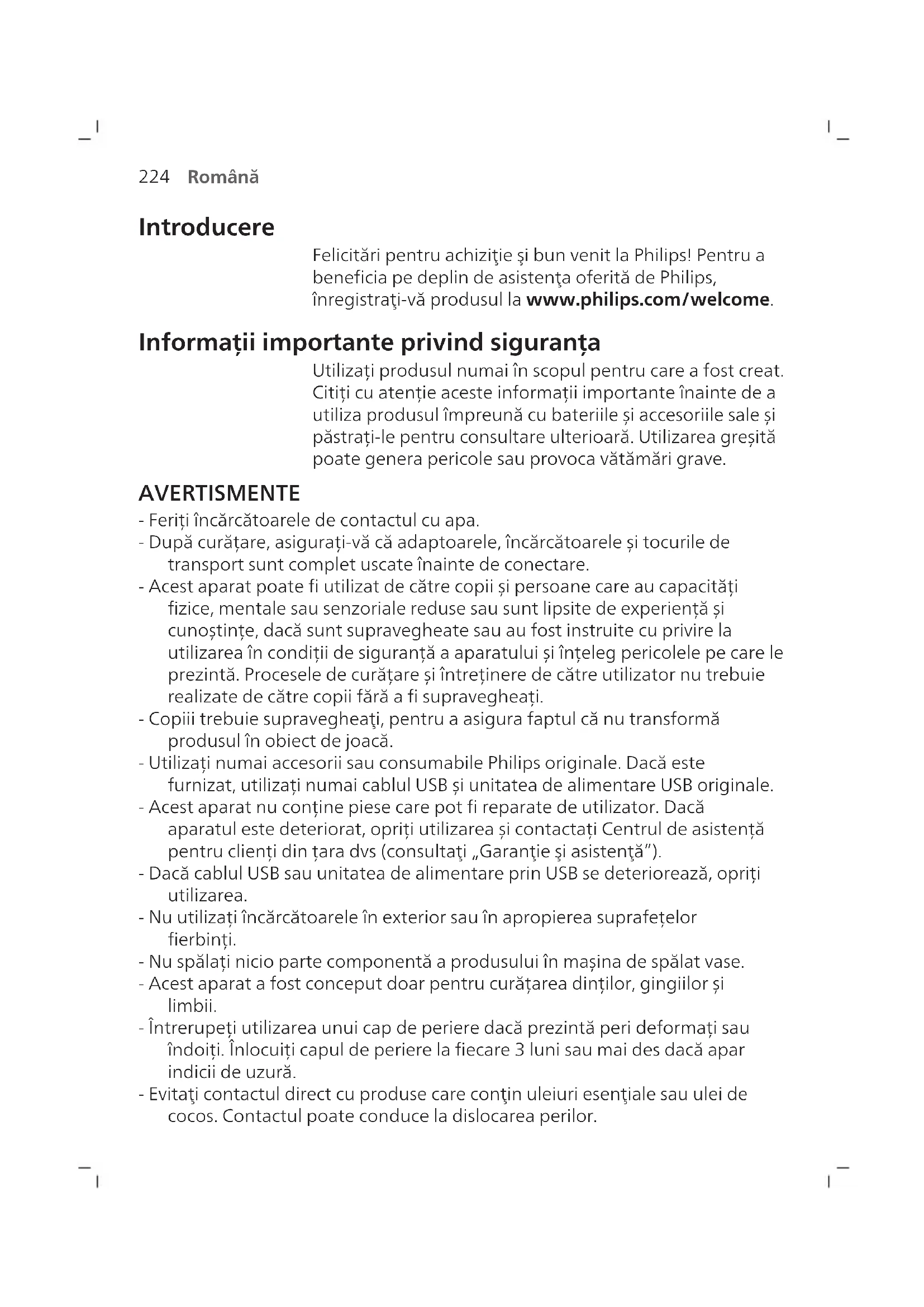 Română Introducere Felicitări pentru achiziţie şi bun venit la Philips! Pentru a beneficia pe deplin de asistenţa oferită de Philips, înregistraţi-vă produsul la www.philips.com/welcome. Informații importante privind siguranța Utilizați produsul numai în scopul pentru care a fost creat. Citiți cu atenție aceste informații importante înainte de a utiliza produsul împreună cu bateriile și accesoriile sale și păstrați-le pentru consultare ulterioară. Utilizarea greșită poate genera pericole sau provoca vătămări grave. AVERTISMENTE - Feriți încărcătoarele de contactul cu apa. - După curățare, asigurați-vă că adaptoarele, încărcătoarele și tocurile de transport sunt complet uscate înainte de conectare. - Acest aparat poate fi utilizat de către copii și persoane care au capacități fizice, mentale sau senzoriale reduse sau sunt lipsite de experiență și cunoștințe, dacă sunt supravegheate sau au fost instruite cu privire la utilizarea în condiții de siguranță a aparatului și înțeleg pericolele pe care le prezintă. Procesele de curățare și întreținere de către utilizator nu trebuie realizate de către copii fără a fi supravegheați. - Copiii trebuie supravegheaţi, pentru a asigura faptul că nu transformă produsul în obiect de joacă. - Utilizați numai accesorii sau consumabile Philips originale. Dacă este furnizat, utilizați numai cablul USB și unitatea de alimentare USB originale. - Acest aparat nu conține piese care pot fi reparate de utilizator. Dacă aparatul este deteriorat, opriți utilizarea și contactați Centrul de asistență pentru clienți din țara dvs (consultaţi „Garanţie şi asistenţă”). - Dacă cablul USB sau unitatea de alimentare prin USB se deteriorează, opriți utilizarea. - Nu utilizați încărcătoarele în exterior sau în apropierea suprafețelor fierbinți. - Nu spălați nicio parte componentă a produsului în mașina de spălat vase. - Acest aparat a fost conceput doar pentru curățarea dinților, gingiilor și limbii. - Întrerupeți utilizarea unui cap de periere dacă prezintă peri deformați sau îndoiți. Înlocuiți capul de periere la fiecare 3 luni sau mai des dacă apar indicii de uzură. - Evitaţi contactul direct cu produse care conţin uleiuri esenţiale sau ulei de cocos. Contactul poate conduce la dislocarea perilor.225 Română AVERTISMENTE MEDICALE - Opriți utilizarea aparatului și consultați stomatologul/medicul dacă apar sângerări excesive după utilizare, dacă sângerarea continuă să apară după 1 săptămână de utilizare sau dacă prezentați disconfort sau durere. - Dacă ați suferit intervenții chirurgicale la gingii sau în cavitatea bucală în ultimele 2 luni, consultați medicul stomatolog înainte de a utiliza acest aparat. - Dacă aveți un stimulator cardiac sau alte dispozitive implantate, contactați medicul sau producătorul dispozitivului implantat, înainte de utilizare. - Dacă aveți probleme medicale, consultați medicul înainte de a utiliza acest aparat. - Acest aparat este un dispozitiv de îngrijire personală și nu este conceput pentru a fi utilizat de mai mulți pacienți într-un cabinet dentar sau o instituție de stomatologie.