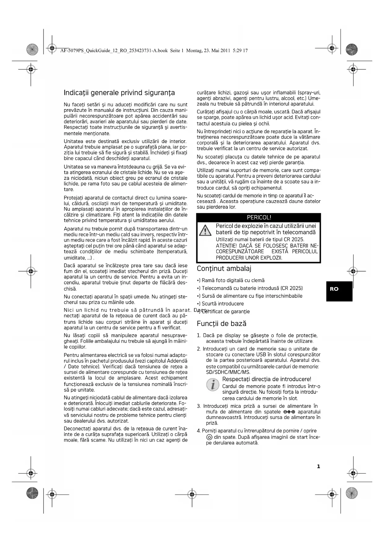 PRODUCERII UNOR EXPLOZII. Respectaţi direcţia de introducere! Cardul de memorie poate fi introdus într-o singură direcţie. Nu folosiţi forţa la introdu- cerea cardului de memorie în slot. AF-5079PS_QuickGuide_12_RO_253423731-A.book Seite 1 Montag, 23. Mai 2011 5:29 172