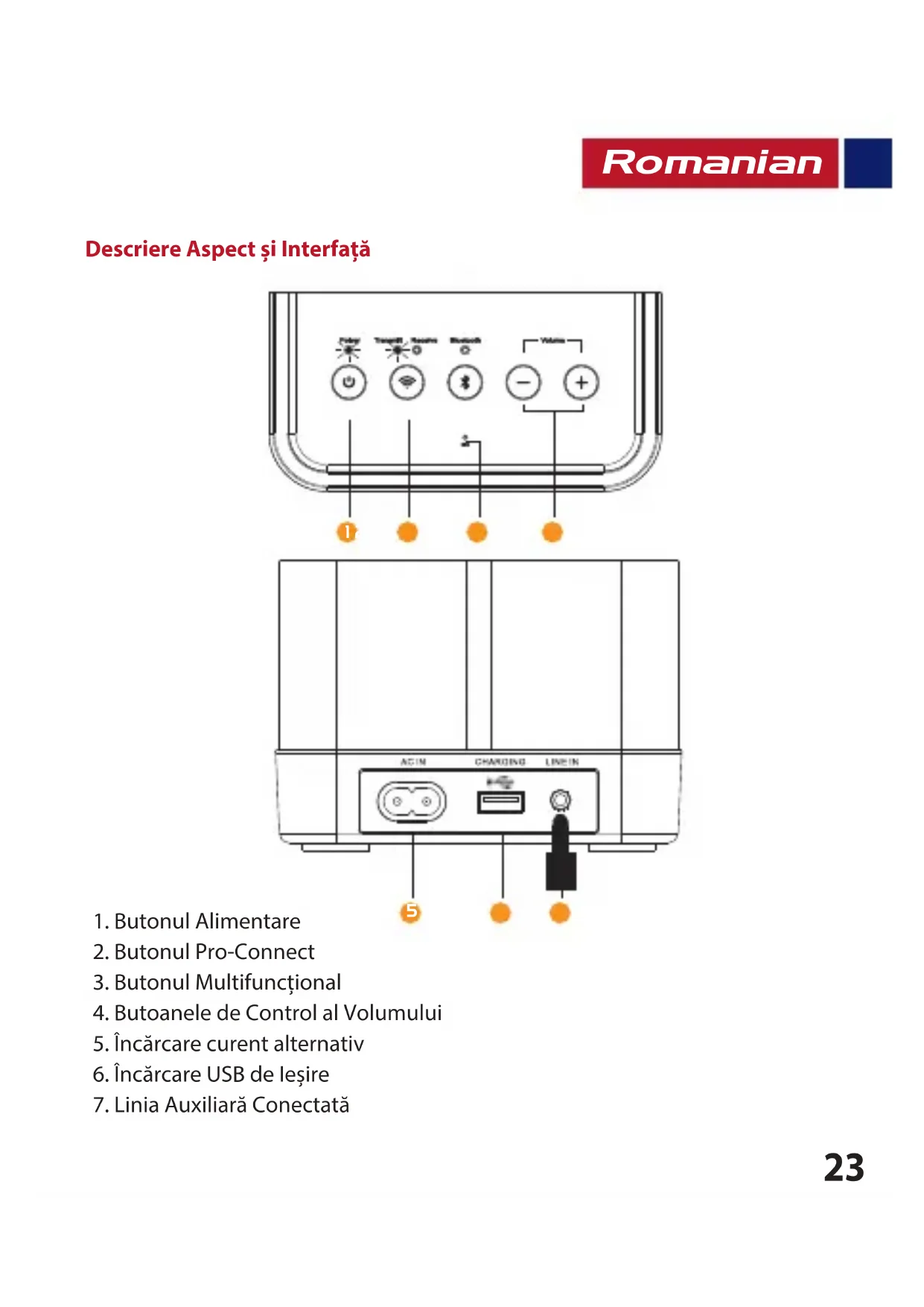 LED Bluetooth Albastru Pornit Prime este conectat la un dispoziv Blue tooth LED intermitent Prime este în mod de "asociere Bluetooth" LED Pro-Connect Chihlimbar Pornit Pro-Connect acvat difuzoare conectate LED intermitent