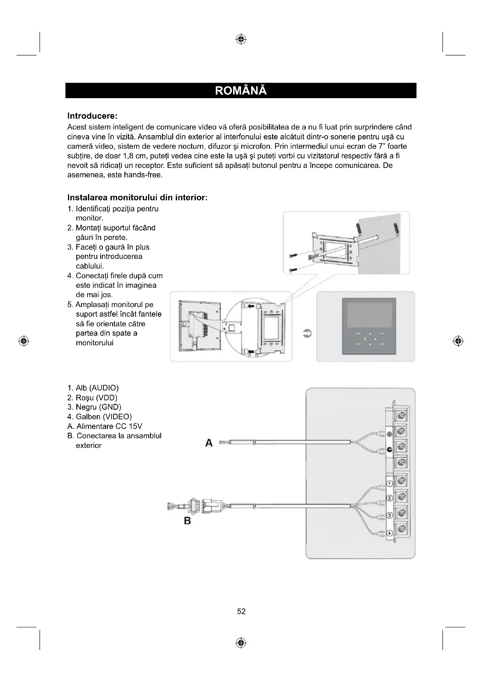 Funcţionarea monitorului din interior: Intercomunicarea Când un vizitator apasă butonul apelare al ansamblului din exterior, monitorul din interior va genera un semnal sonor şi va activa ecranul monitorului. Ecranul monitorului din interior va afişa în mod automat o imagine a vizitatorului. Apăsaţi butonul Monitor şi vorbiţi cu vizitatorul. Când aţi încheiat convorbirea cu vizitatorul, apăsaţi din nou butonul Monitor pentru a închide ecranul. Sau apăsaţi butonul descuiere pentru a deschide uşa. De asemenea, ecranul se va închide automat dacă niciun buton nu este acţionat. Monitorul Apăsaţi butonul Monitor. Ecranul va afişa în mod automat o fotografie a planului exterior uşii de la intrare. Apăsaţi încă o dată butonul pentru a închide monitorul sau monitorul se va închide automat după un timp. Meniu Apăsaţi butonul Meniu pentru a intra în meniul principal. Folosiţi cursoarele direcţionale ÎN SUS şi ÎN JOS pentru a selecta o poziţie şi folosiţi butoanele STÂNGA şi DREAPTA pentru a modifica parametrii poziţiei. Apăsaţi butonul ESC pentru a părăsi meniul.