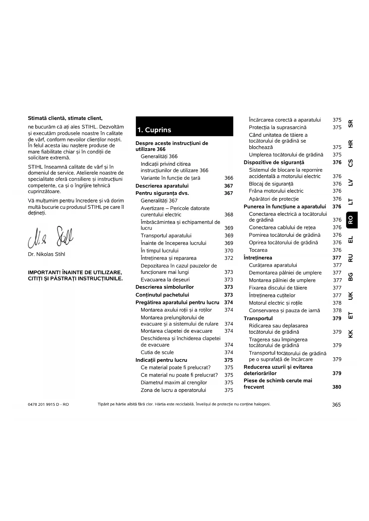 SRHRCSLVLTRO 0478 201 9915 D - RO ELRUBGUKETKK Stimată clientă, stimate client, ne bucurăm că aţi ales STIHL. Dezvoltăm şi executăm produsele noastre în calitate de vârf, conform nevoilor clienţilor noştri. În felul acesta iau naştere produse de mare fiabilitate chiar şi în condiţii de solicitare extremă. STIHL înseamnă calitate de vârf şi în domeniul de service. Atelierele noastre de specialitate oferă consiliere şi instrucţiuni competente, ca şi o îngrijire tehnică cuprinzătoare. Vă mulţumim pentru încredere şi vă dorim multă bucurie cu produsul STIHL pe care îl deţineţi. Dr. Nikolas Stihl IMPORTANT! ÎNAINTE DE UTILIZARE, CITIŢI ŞI PĂSTRAŢI INSTRUCŢIUNILE. Tipărit pe hârtie albită fără clor. Hârtia este reciclabilă. Învelişul de protecţie nu conţine halogeni.