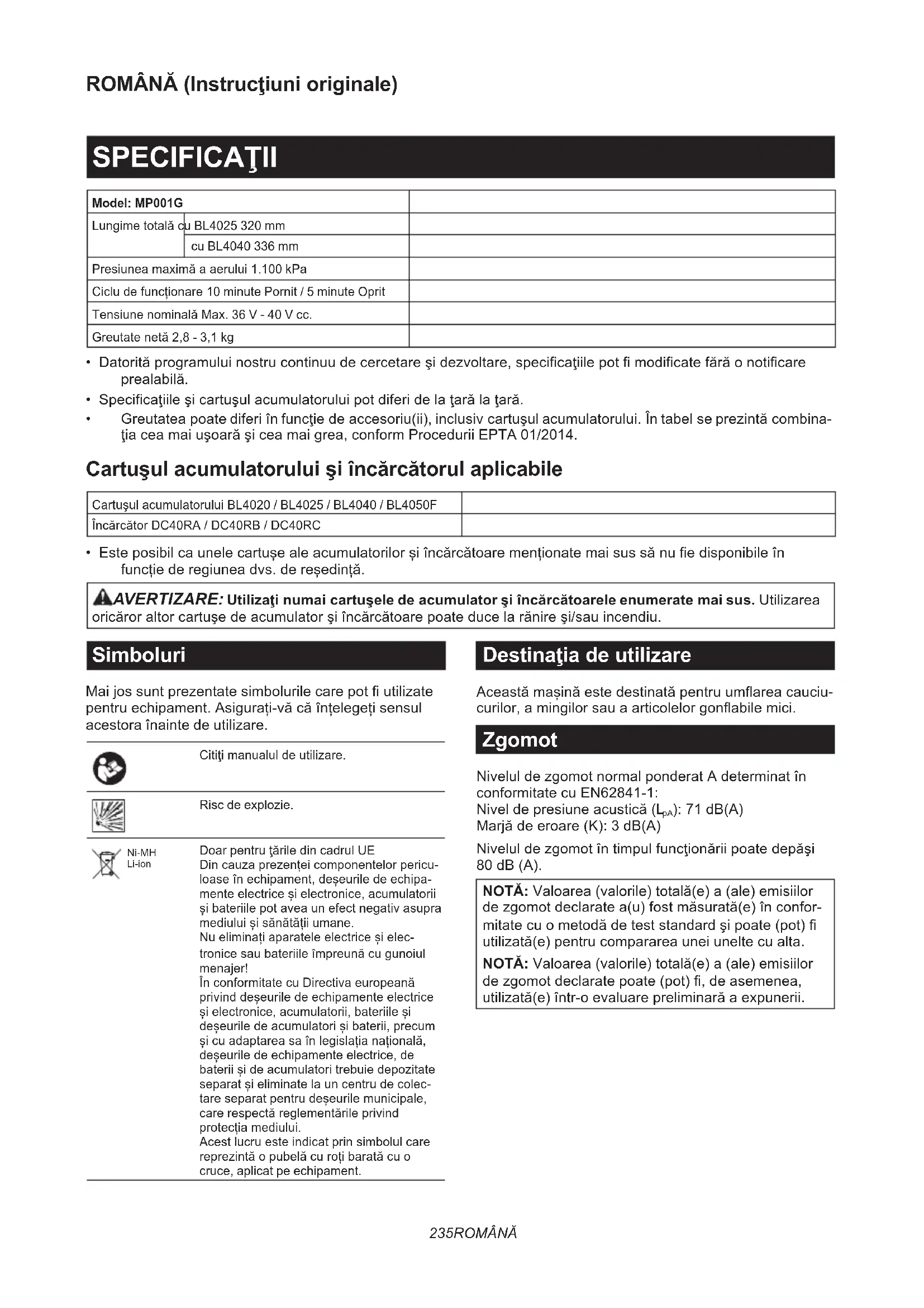 - Este posibil ca unele cartușe ale acumulatorilor și încărcătoare menționate mai sus să nu e disponibile în funcție de regiunea dvs. de reședință. AVERTIZARE: Utilizaţi numai cartuşele de acumulator şi încărcătoarele enumerate mai sus. Utilizarea oricăror altor cartuşe de acumulator şi încărcătoare poate duce la rănire şi/sau incendiu. Simboluri Mai jos sunt prezentate simbolurile care pot utilizate pentru echipament. Asigurați-vă că înțelegeți sensul acestora înainte de utilizare. Citiţi manualul de utilizare. Risc de explozie. Ni-MH Li-ion Doar pentru ţările din cadrul UE Din cauza prezenței componentelor pericu- loase în echipament, deșeurile de echipa- mente electrice și electronice, acumulatorii și bateriile pot avea un efect negativ asupra mediului și sănătății umane. Nu eliminați aparatele electrice și elec- tronice sau bateriile împreună cu gunoiul menajer! În conformitate cu Directiva europeană privind deșeurile de echipamente electrice și electronice, acumulatorii, bateriile și deșeurile de acumulatori și baterii, precum și cu adaptarea sa în legislația națională, deșeurile de echipamente electrice, de baterii și de acumulatori trebuie depozitate separat și eliminate la un centru de colec- tare separat pentru deșeurile municipale, care respectă reglementările privind protecția mediului. Acest lucru este indicat prin simbolul care reprezintă o pubelă cu roți barată cu o cruce, aplicat pe echipament. Destinaţia de utilizare Această mașină este destinată pentru umarea cauciu- curilor, a mingilor sau a articolelor gonabile mici. Zgomot Nivelul de zgomot normal ponderat A determinat în conformitate cu EN62841-1: Nivel de presiune acustică (L