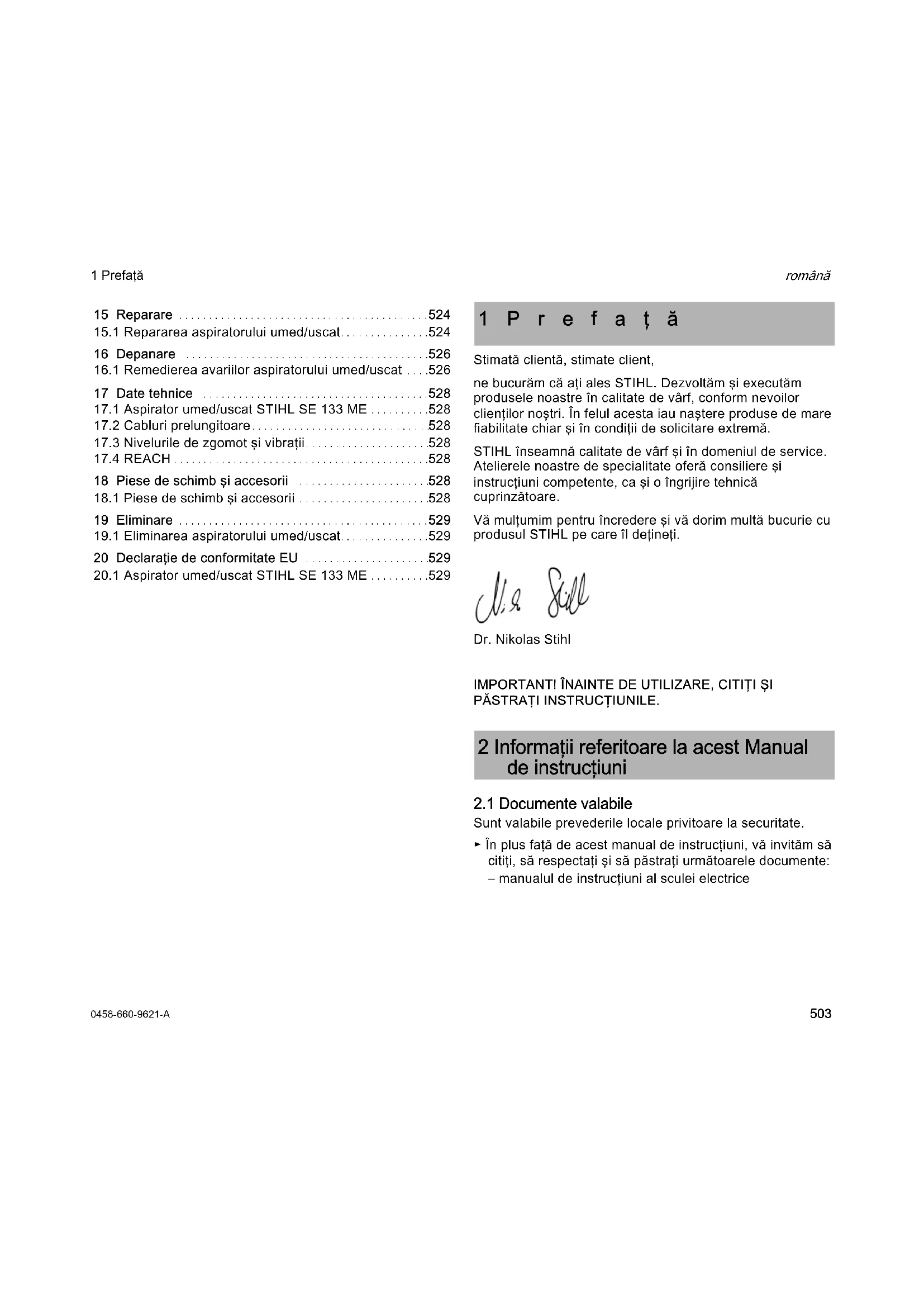 română 1 Prefaţă Stimată clientă, stimate client, ne bucurăm că aţi ales STIHL. Dezvoltăm şi executăm produsele noastre în calitate de vârf, conform nevoilor clienţilor noştri. În felul acesta iau naştere produse de mare fiabilitate chiar şi în condiţii de solicitare extremă. STIHL înseamnă calitate de vârf şi în domeniul de service. Atelierele noastre de specialitate oferă consiliere şi instrucţiuni competente, ca şi o îngrijire tehnică cuprinzătoare. Vă mulţumim pentru încredere şi vă dorim multă bucurie cu produsul STIHL pe care îl deţineţi. Dr. Nikolas Stihl IMPORTANT! ÎNAINTE DE UTILIZARE, CITIŢI ŞI PĂSTRAŢI INSTRUCŢIUNILE.