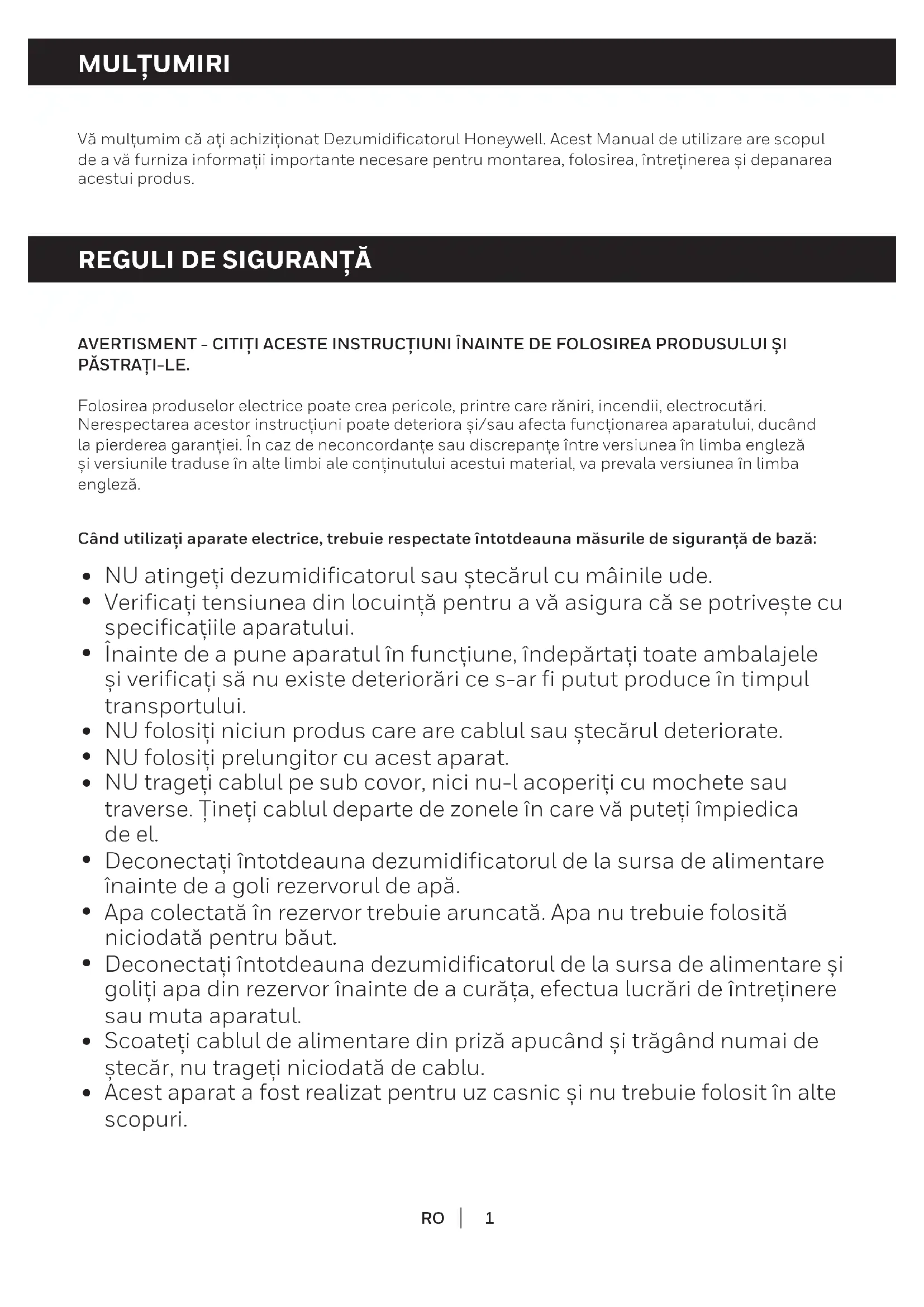 Vă mulţumim că aţi achiziţionat Dezumidificatorul Honeywell. Acest Manual de utilizare are scopul de a vă furniza informaţii importante necesare pentru montarea, folosirea, întreţinerea și depanarea acestui produs. AVERTISMENT - CITIŢI ACESTE INSTRUCŢIUNI ÎNAINTE DE FOLOSIREA PRODUSULUI ȘI PĂSTRAŢI-LE. Folosirea produselor electrice poate crea pericole, printre care răniri, incendii, electrocutări. Nerespectarea acestor instrucţiuni poate deteriora și/sau afecta funcţionarea aparatului, ducând la pierderea garanţiei. În caz de neconcordanţe sau discrepanţe între versiunea în limba engleză și versiunile traduse în alte limbi ale conţinutului acestui material, va prevala versiunea în limba engleză. Când utilizaţi aparate electrice, trebuie respectate întotdeauna măsurile de siguranţă de bază: