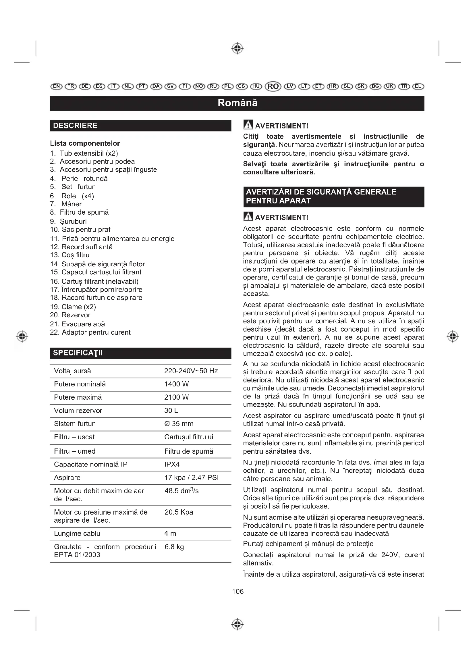 EN FR DE ES IT NL PT DA SV FI NO RU PL CS HU LV LT ET HR SL SK UKBG TR EL copiilor accesul la aspirator. Nu utilizați niciodată aparatul electrocasnic când sunteți sub infl uența medicamentelor, a alcoolului sau a drogurilor, dacă sunteți sub tratament medical sau dacă sunteți în stare de oboseală. Verifi cați cu regularitate aspiratorul și cablul de alimentare cu energie să nu fi e posibile defecte. Nu utilizați aparate electrocasnice defecte. Nu încercați să reparați dvs. înșivă aparatul electrocasnic. Pentru reparații, apelați întotdeauna la un tehnician autorizat. Cablurile de alimentare cu energie electrică defecte trebuie înlocuite imediat de către producător sau de către un centru de service califi cat. Utilizați același tip de cablu pentru a preveni pericolul de electrocutare. Utilizați doar accesorii și piese de schimb originale Piesele și accesoriile neaprobate sau de la terți pot fi o posibilă sursă de pericol și pot fi cauza invalidării garanției. Verifi ca ți cu regularitate fl otorul. Dacă observați scurgeri de lichid de la aspiratorul dvs, opriți-l imediat și deconectați-l de la priza de curent. Nu scufundați aspiratorul în apă. Asigurați-vă că aparatul electrocasnic nu este stropit cu apă. La aruncarea apei uzate, asigurați-vă că respectați toate normele legale. Depozitați aparatul electrocasnic într-un loc uscat și în condiții de siguranță, departe de accesul copiilor. Vă rugăm acordați o atenție deosebită capitolului următor „Reguli speciale de siguranță”. Acest aparat nu este destinat a fi folosit sau curăţat de către persoane cu capacităţi fi zice, senzoriale sau mintale reduse, sau de către cele fără experienţă sau cunoştinţe decât dacă au fost instruite în ce priveşte folosirea în siguranţă a acestui aparat din partea unei persoane legal responsabilă pentru siguranţa lor. Ele trebuiesc supravegheate în timpul folosirii aparatului. Copiii nu trebuie să folosească, să cureţe sau să se joace cu acest aparat, care atunci când nu este folosit trebuie păstrat ferit de copii. Copiii trebuie supravegheaţi pentru a nu avea posibilitatea să se joace cu acest dispozitiv. Pentru evitarea oricărui pericol, un cablu de alimentare deteriorat trebuie înlocuit de producător, de agentul său de service sau de personal cu califi care similară. Energia electrică trebuie furnizată printr-un dispozitiv de curent rezidual (DCR) cu curent de anclanșare nu mai mare de 30 mA. A se utiliza numai cablu prelungitor rezistent la intemperii. un sac adecvat de colectare a prafului în suport. Un sac de colectare a prafului inadecvat sau incorect instalat, poate cauza deteriorarea aspiratorului și este o cauză pentru invalidarea garanției. Dacă cablul de alimentare cu energie este deteriorat, trebuie înlocuit integral, împreună cu protecția sa, la un centru autorizat de service sau de către o organizație de service califi cată . Nu aspirați cenușă, cărbuni aprinși și altele asemenea, cioburi mari de sticlă și nici obiecte tăioase. Nu aspirați pulbere de toner utilizat la imprimante și copiatoare, de exemplu, fi indcă acestea sunt conducătoare electrice. În plus, este posibil să nu se poată scoate complet din sistemul fi ltru al aspiratorului umed/ uscat și poate fi eliberat în atmosferă prin intermediul ventilatorului de evacuare. Nu aspirați niciodată lichide otrăvitoare sau infl amabile, precum petrol, benzină, acizi sau alte substanțe volatile. Nu aspirați niciodată lichide cu temperatura mai mare de 60°C sau alte pulberi otrăvitoare sau infl amabile. Nu lăsați niciodată aspiratorul culcat pe o parte. Acordați o atenție deosebită poziției orizontale și stabilității pe scări. Întotdeauna aspiratorul trebuie deconectat de la priza de curent înainte de a fi curățat sau înainte de a i se schimba accesoriile sau fi ltrele. Reparațiile la un echipament electric trebuie făcut numai de către personal specializat. Reparațiile inadecvate pot determina un risc considerabil pentru utilizator. Nu depozitați aspiratorul direct lângă un radiator sau cuptor încins. Copii, persoanele cu dizabilități și persoanele în vârstă deseori nu sunt conștienți de pericolul care rezultă din mânuirea aparatelor electrocasnice. Persoanele de tipul celor mai sus menționate și persoanele neinstruite nu trebuie să lucreze niciodată cu acest aparat electrocasnic. Când acest aparat electrocasnic este curățat sau mutat, întotdeauna trebuie oprit. Deconectaț i aspiratorul de la priza de perete, dacă intenționați să nu îl utilizați un timp mai îndelungat. Nu trageți niciodată de cablu pentru a-l scoate din priză, în schimb țineți bine de priză și de ștecher. La fel, scoateți și accesoriile speciale de la aspirator. Întotdeauna țineți asiratorul în stare de curățenie. Nu utilizați solvenți sau soluții de curățare care ar putea fi dăunătoare pentru aspirator sau pentru utilizator. Nu lăsați niciodată aspiratorul funcționând nesupravegheat. Dacă părăsiți zona de lucru, opriți aspiratorul de la comutator și deconectați-l de la priza de perete (nu trageți de cablu, ci apucați cu mâna ștecherul). Pentru a proteja copiii împotriva riscurilor implicate de aparatele electrocasnice, asigurați-vă că nu se vor împiedica copiii în cablul de alimentare ș i nu permiteți108 Română