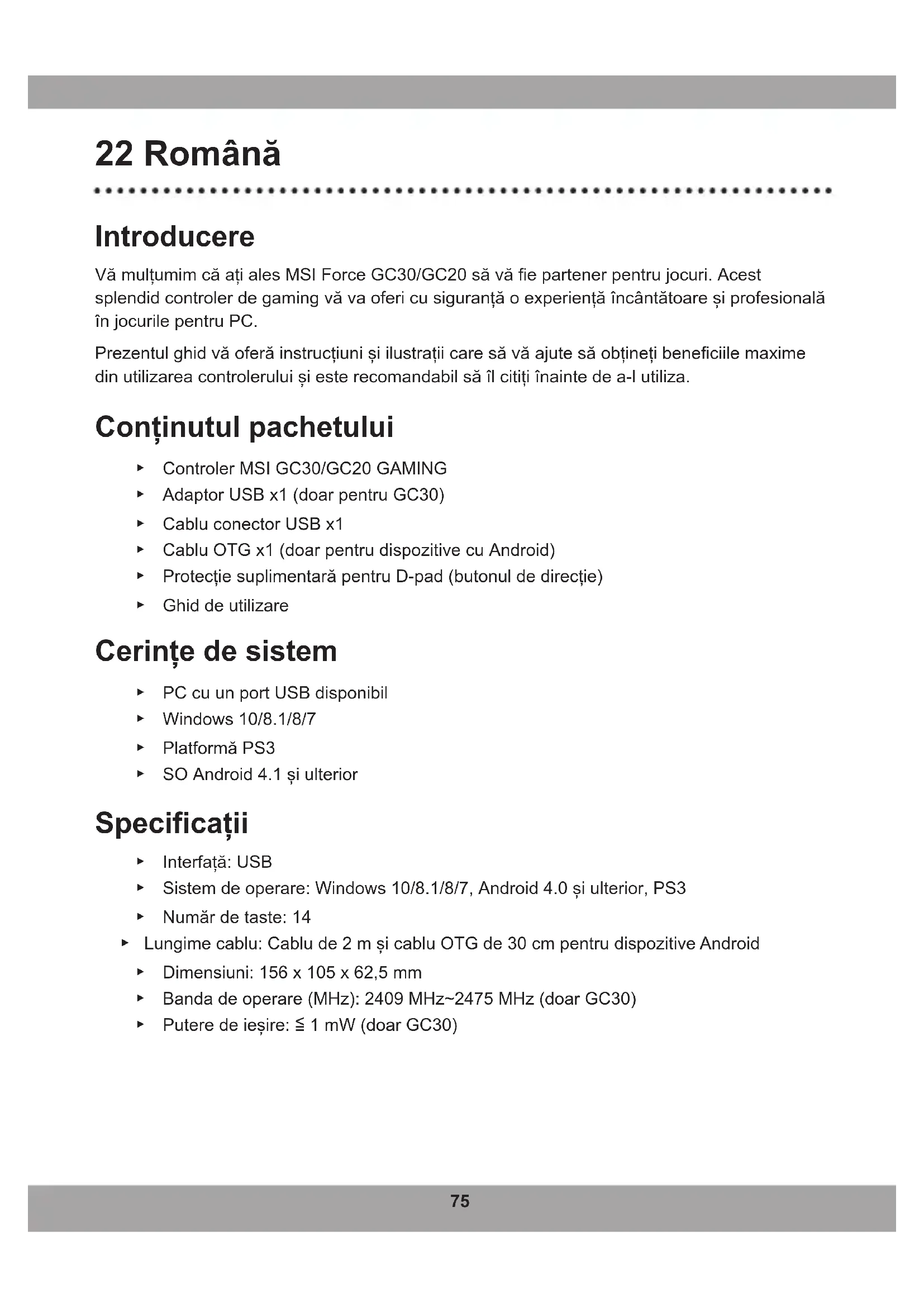 - Lysdiodane 3 og 4-modus lyser når denne modusen er vald.75 22 Română Introducere Vă mulțumim că ați ales MSI Force GC30/GC20 să vă fie partener pentru jocuri. Acest splendid controler de gaming vă va oferi cu siguranță o experiență încântătoare și profesională în jocurile pentru PC. Prezentul ghid vă oferă instrucțiuni și ilustrații care să vă ajute să obțineți beneficiile maxime din utilizarea controlerului și este recomandabil să îl citiți înainte de a-l utiliza. Conținutul pachetului ▶ Controler MSI GC30/GC20 GAMING ▶ Adaptor USB x1 (doar pentru GC30) ▶ Cablu conector USB x1 ▶ Cablu OTG x1 (doar pentru dispozitive cu Android) ▶ Protecție suplimentară pentru D-pad (butonul de direcție) ▶ Ghid de utilizare Cerințe de sistem ▶ PC cu un port USB disponibil ▶ Windows 10/8.1/8/7 ▶ Platformă PS3 ▶ SO Android 4.1 și ulterior Specificații ▶ Interfață: USB ▶ Sistem de operare: Windows 10/8.1/8/7, Android 4.0 și ulterior, PS3 ▶ Număr de taste: 14 ▶ Lungime cablu: Cablu de 2 m și cablu OTG de 30 cm pentru dispozitive Android ▶ Dimensiuni: 156 x 105 x 62,5 mm ▶ Banda de operare (MHz): 2409 MHz~2475 MHz (doar GC30) ▶ Putere de ieșire: ≦ 1 mW (doar GC30)76 Privire de ansamblu