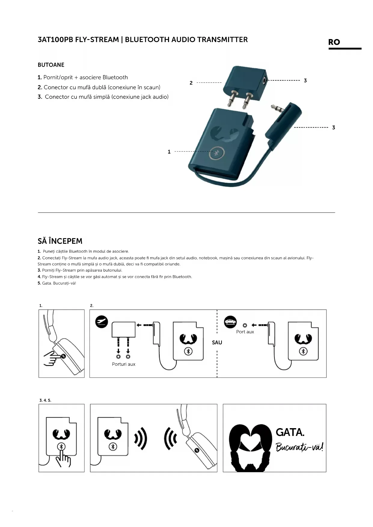 2. Conectați Fly-Stream la mufa audio jack, aceasta poate fi mufa jack din setul audio, notebook, mașină sau conexiunea din scaun al avionului. Fly- Stream conține o mufă simplă și o mufă dublă, deci va fi compatibil oriunde.3. Porniți Fly-Stream prin apăsarea butonului.4. Fly-Stream și căștile se vor găsi automat și se vor conecta fără fir prin Bluetooth.5. Gata. Bucurați-vă!