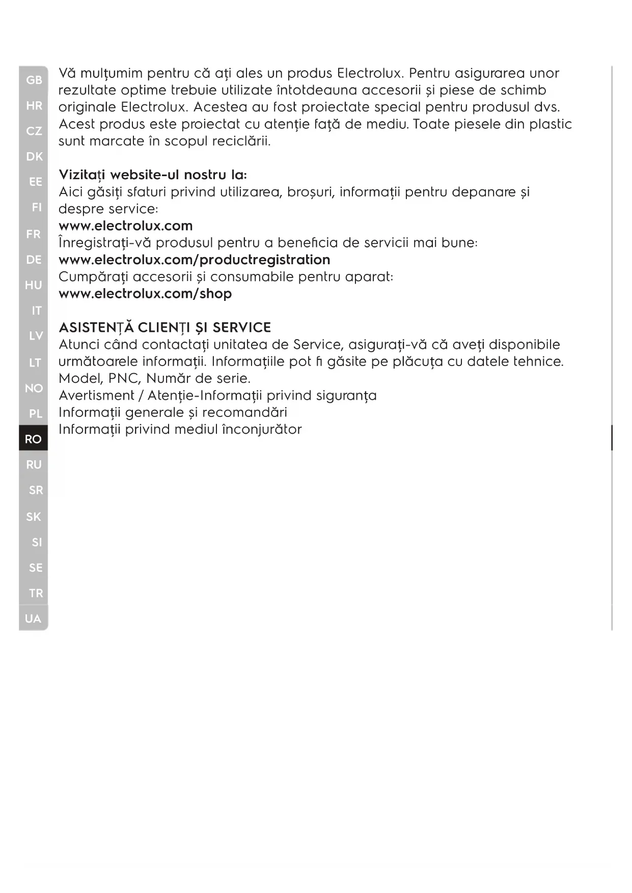 Vă mulțumim pentru că ați ales un produs Electrolux. Pentru asigurarea unor rezultate optime trebuie utilizate întotdeauna accesorii și piese de schimb originale Electrolux. Acestea au fost proiectate special pentru produsul dvs. Acest produs este proiectat cu atenție față de mediu. Toate piesele din plastic sunt marcate în scopul reciclării. Vizitați website-ul nostru la: Aici găsiți sfaturi privind utilizarea, broșuri, informații pentru depanare și despre service: www.electrolux.com Înregistrați-vă produsul pentru a beneficia de servicii mai bune: www.electrolux.com/productregistration Cumpărați accesorii și consumabile pentru aparat: www.electrolux.com/shop