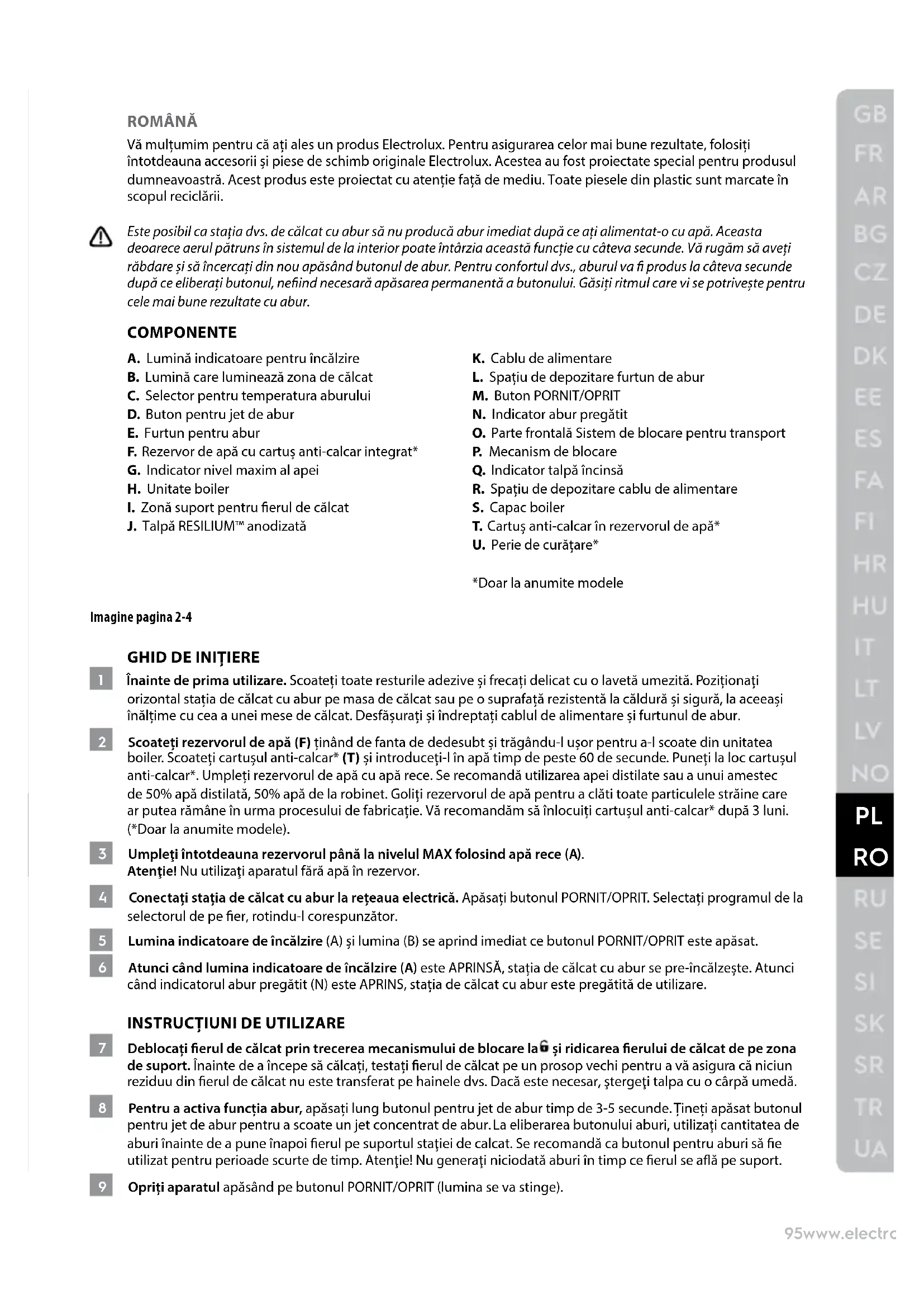ROMÂNĂ Vă mulțumim pentru că ați ales un produs Electrolux. Pentru asigurarea celor mai bune rezultate, folosiți întotdeauna accesorii și piese de schimb originale Electrolux. Acestea au fost proiectate special pentru produsul dumneavoastră. Acest produs este proiectat cu atenție față de mediu. Toate piesele din plastic sunt marcate în scopul reciclării. Este posibil ca stația dvs. de călcat cu abur să nu producă abur imediat după ce ați alimentat-o cu apă. Aceasta deoarece aerul pătruns în sistemul de la interior poate întârzia această funcție cu câteva secunde. Vă rugăm să aveți răbdare și să încercați din nou apăsând butonul de abur. Pentru confortul dvs., aburul va produs la câteva secunde după ce eliberați butonul, neind necesară apăsarea permanentă a butonului. Găsiți ritmul care vi se potrivește pentru cele mai bune rezultate cu abur. COMPONENTE A. Lumină indicatoare pentru încălzire B. Lumină care luminează zona de călcat C. Selector pentru temperatura aburului D. Buton pentru jet de abur E. Furtun pentru abur F. Rezervor de apă cu cartuș anti-calcar integrat* G. Indicator nivel maxim al apei H. Unitate boiler