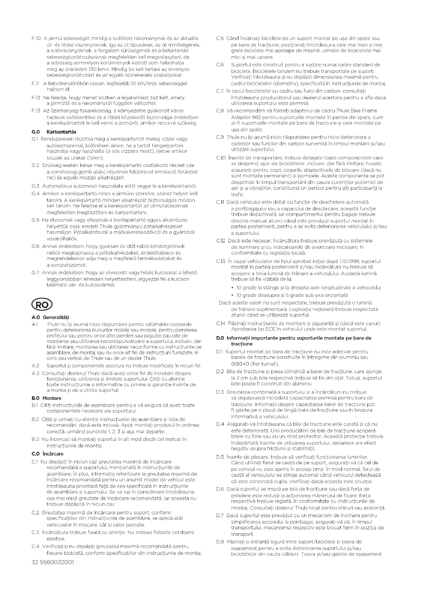 A.0 Generalităţi A.1 Thule nu îşi asumă nicio răspundere pentru vătămările corporale, pentru deteriorarea bunurilor mobile sau imobile, pentru pierderea profitului sau pentru orice alte pierderi sau pagube cauzate de montarea sau utilizarea necorespunzătoare a suportului, inclusiv, dar fără limitare, montarea sau utilizarea neconforme cu instrucţiunile de asamblare, de montaj sau cu orice alt fel de instrucţiuni furnizate, în scris sau verbal, de Thule sau de un dealerThule. A.2 Suportul şi componentele acestuia nu trebuie modificate în niciun fel. A.3 Consultaţi dealerul Thule dacă aveţi orice fel de întrebări despre funcţionarea, utilizarea şi limitele suportului. Citiţi cu atenţie toate instrucţiunile şi informaţiile cu privire la garanţie înainte de amonta şi de a utiliza suportul. B.0 Montare B.1 Citiţi instrucţiunile de asamblare pentru a vă asigura că aveţi toate componentele necesare ale suportului. B.2 Citiţi şi urmaţi cu atenţie instrucţiunile de asamblare şi lista de recomandări, dacă este inclusă. Apoi, montaţi produsul în ordinea corectă, urmând punctele 1, 2, 3 şi aşa mai departe. B.3 Nu încercaţi să montaţi suportul în alt mod decât cel indicat în instrucţiunile de montaj. C.0 Încărcare C.1 Nu depăşiţi în niciun caz greutatea maximă de încărcare recomandată a suportului, menţionată în instrucţiunile de asamblare. În plus, informaţia referitoare la greutatea maximă de încărcare recomandată pentru un anumit model de vehicul este întotdeauna prioritară faţă de cea specificată în instrucţiunile de asamblare a suportului. Se va lua în considerare întotdeauna cea mai mică greutate de încărcare recomandată, iar aceasta nu trebuie depăşită în niciun caz. C.2 Greutatea maximă de încărcare pentru suport, conform specificaţiilor din instrucţiunile de asamblare, se aplică atât vehiculelor în mişcare, cât şi celor parcate. C.3 Încărcătura trebuie fixată cu atenţie. Nu trebuie folosite cordoane elastice. C.4 Verificaţi şi nu depăşiţi greutatea maximă recomandată pentru fiecare bicicletă, conform specificaţiilor din instrucţiunile de montaj. C.5 Când încărcaţi biciclete pe un suport montat pe uşa din spate sau pe bara de tracţiune, poziţionaţi întotdeauna cele mai mari şi mai grele biciclete mai aproape de maşină, urmate de bicicletele mai mici şi mai uşoare. C.6 Suportul este construit pentru a susţine numai cadre standard de biciclete. Bicicletele tandem nu trebuie transportate pe suport. Verificaţi întotdeauna şi nu depăşiţi dimensiunea maximă pentru cadrul bicicletelor (diametru), specificată în instrucţiunile de montaj. C.7 În cazul bicicletelor cu cadru sau furci din carbon, consultaţi întotdeauna producătorul sau dealerul acestora pentru a afla dacă utilizarea suportului este permisă. C.8 Vă recomandăm să folosiţi adaptorul de cadru Thule Bike Frame Adapter 982 pentru suporturile montate în partea din spate, cum ar fi suporturile montate pe bara de tracţiune şi cele montate pe uşa din spate. C.9 Thule nu îşi asumă nicio răspundere pentru nicio deteriorare a cadrelor sau furcilor din carbon survenită în timpul montării şi/sau utilizării suportului. C.10 Înainte de transportare, trebuie detașate toate componentele care se desprind ușor ale bicicletelor, inclusiv, dar fără limitare, husele, scaunele pentru copii, coșurile, dispozitivele de blocare (dacă nu sunt montate permanent) și pompele. Aceste componente se pot desprinde în timpul transportării din cauza curenţilor puternici de aer și a vibraţiilor, constituind un pericol pentru alţi participanţi la trafic. C.11 Dacă vehiculul este dotat cu funcţie de deschidere automată a portbagajului sau a capacului de descărcare, această funcţie trebuie dezactivată, iar compartimentul pentru bagaje trebuie deschis manual atunci când este prevăzut suportul montat în partea posterioară, pentru a se evita deteriorarea vehiculului şi/sau a suportului. C.12 Dacă este necesar, încărcătura trebuie prevăzută cu sistemele de iluminare şi cu indicatoarele de avertizare necesare, în conformitate cu legislaţia locală. C.13 În cazul vehiculelor de tipul aprobat iniţial după 1.10.1998, suportul montat în partea posterioară şi/sau încărcătura nu trebuie să acopere a treia lumină de frânare a vehiculului. Această lumină trebuie să fie vizibilă de la:
