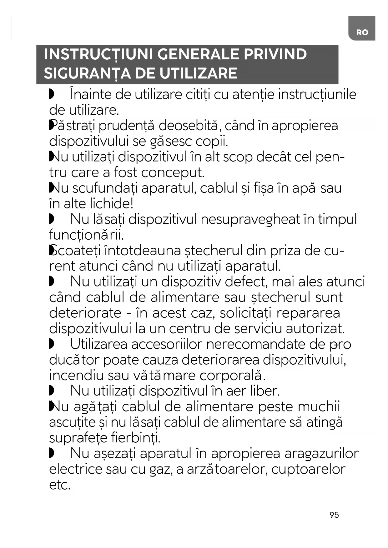 Prezentul dispozitiv poate fi utilizat de către co- pii cu vârsta cel puţin 8 ani și de persoanele cu abilităţi fizice, mentale, senzoriale reduse precum și persoanele fără experienţă și cunoașterea dispozitivului numai dacă este asigurată supra- veghere sau instrucţiunile cu pri vire la utilizarea dispozitivului în condiţii de siguranţă, astfel în- cât riscurile asociate sunt înţelese. Curăţarea și întreţinerea nu trebuie să fie efectuate de copii decât dacă aceștia au cel puţin 8 ani și sunt su- pravegheaţi. Copiii nesupravegheaţi nu trebuie să se ocupe de curăţare/întreţinere.