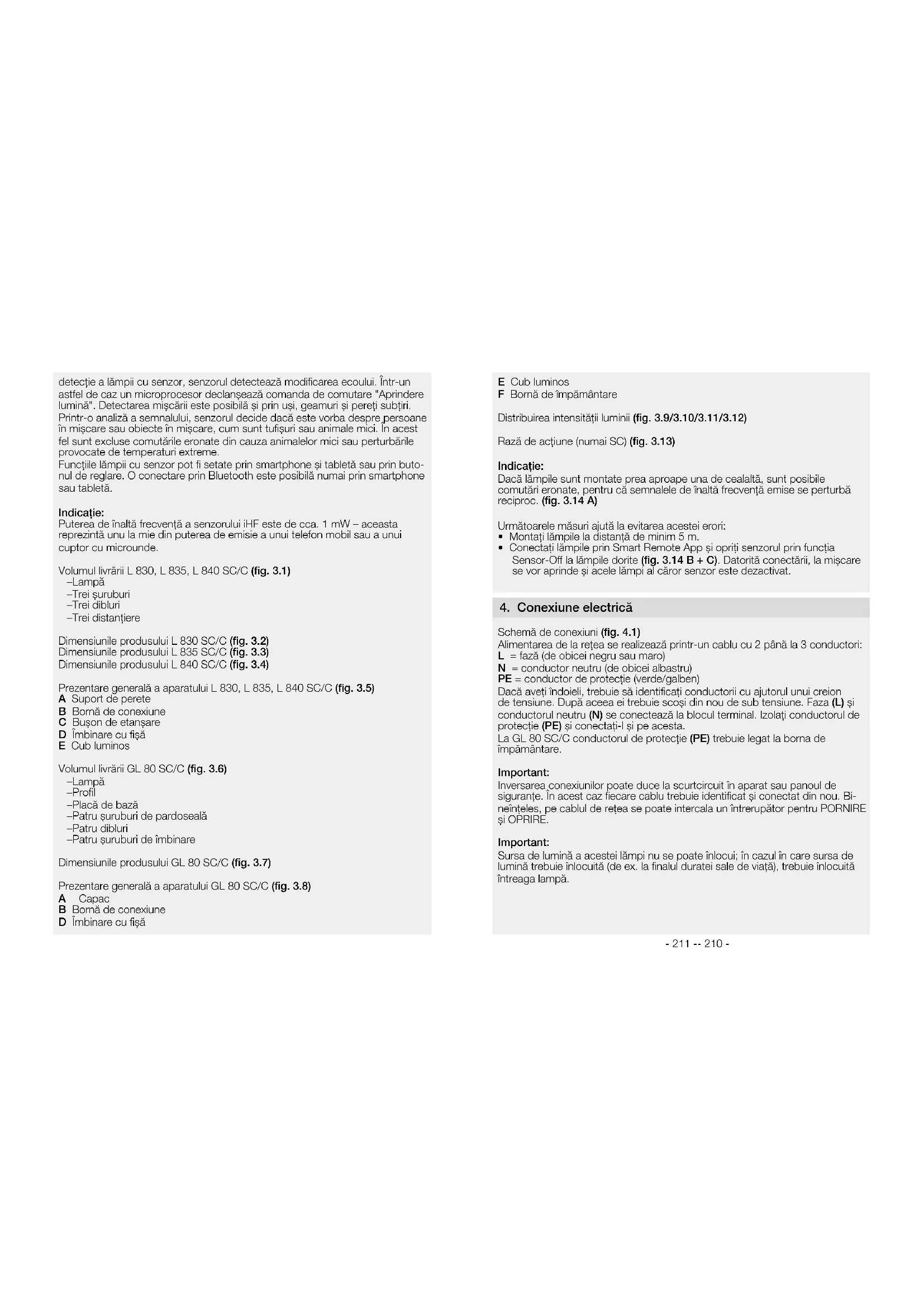 !- 211 -- 210 - detecţie a lămpii cu senzor, senzorul detectează modificarea ecoului. Într-un astfel de caz un microprocesor declanşează comanda de comutare "Aprindere lumină". Detectarea mişcării este posibilă şi prin uşi, geamuri şi pereţi subţiri. Printr-o analiză a semnalului, senzorul decide dacă este vorba despre persoane în mişcare sau obiecte în mişcare, cum sunt tufişuri sau animale mici. În acest fel sunt excluse comutările eronate din cauza animalelor mici sau perturbările provocate de temperaturi extreme. Funcţiile lămpii cu senzor pot fi setate prin smartphone şi tabletă sau prin buto- nul de reglare. O conectare prin Bluetooth este posibilă numai prin smartphone sau tabletă. Indicaţie: Puterea de înaltă frecvenţă a senzorului iHF este de cca. 1 mW – aceasta reprezintă unu la mie din puterea de emisie a unui telefon mobil sau a unui cuptor cu microunde. Volumul livrării L830, L835, L840SC/C (fig.3.1) – Lampă – Trei şuruburi – Trei dibluri – Trei distanţiere Dimensiunile produsului L 830SC/C(fig.3.2) Dimensiunile produsului L 835SC/C(fig.3.3) Dimensiunile produsului L 840SC/C(fig.3.4) Prezentare generală a aparatului L830, L835, L840SC/C (fig.3.5) A Suport de perete B Bornă de conexiune C Buşon de etanşare D Îmbinare cu fişă E Cub luminos Volumul livrării GL 80SC/C(fig.3.6) – Lampă – Profil – Placă de bază – Patru şuruburi de pardoseală – Patru dibluri – Patru şuruburi de îmbinare Dimensiunile produsului GL 80SC/C(fig.3.7) Prezentare generală a aparatului GL 80SC/C(fig.3.8) A Capac B Bornă de conexiune D Îmbinare cu fişă E Cub luminos F Bornă de împământare Distribuirea intensităţii luminii (fig.3.9/3.10/3.11/3.12) Rază de acţiune (numai SC) (fig.3.13) Indicaţie: Dacă lămpile sunt montate prea aproape una de cealaltă, sunt posibile comutări eronate, pentru că semnalele de înaltă frecvenţă emise se perturbă reciproc. (fig.3.14A) Următoarele măsuri ajută la evitarea acestei erori: