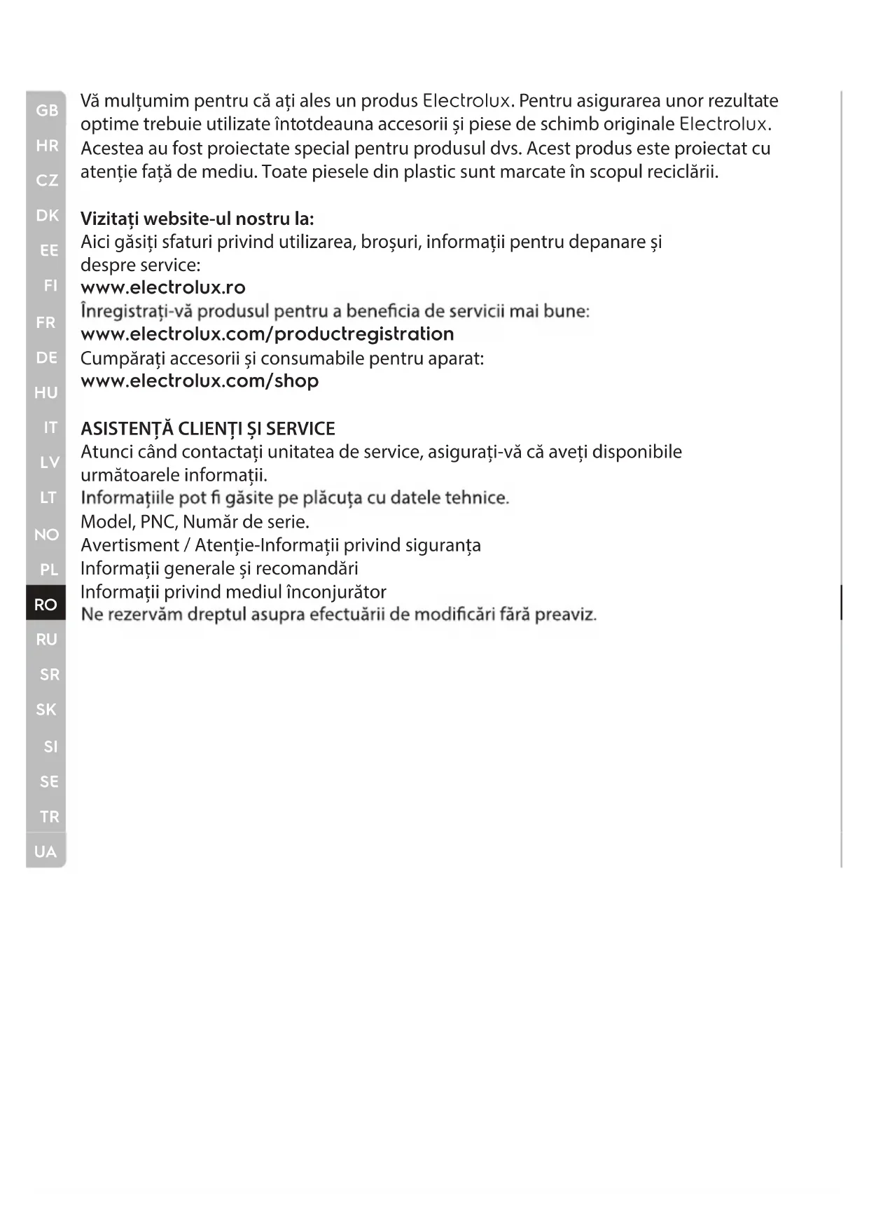 Vă mulțumim pentru că ați ales un produs Electrolux. Pentru asigurarea unor rezultate optime trebuie utilizate întotdeauna accesorii și piese de schimb originale Electrolux. Acestea au fost proiectate special pentru produsul dvs. Acest produs este proiectat cu atenție față de mediu. Toate piesele din plastic sunt marcate în scopul reciclării. Vizitați website-ul nostru la: Aici găsiți sfaturi privind utilizarea, broșuri, informații pentru depanare și despre service: www.electrolux.ro www.electrolux.com/productregistration Cumpărați accesorii și consumabile pentru aparat: www.electrolux.com/shop