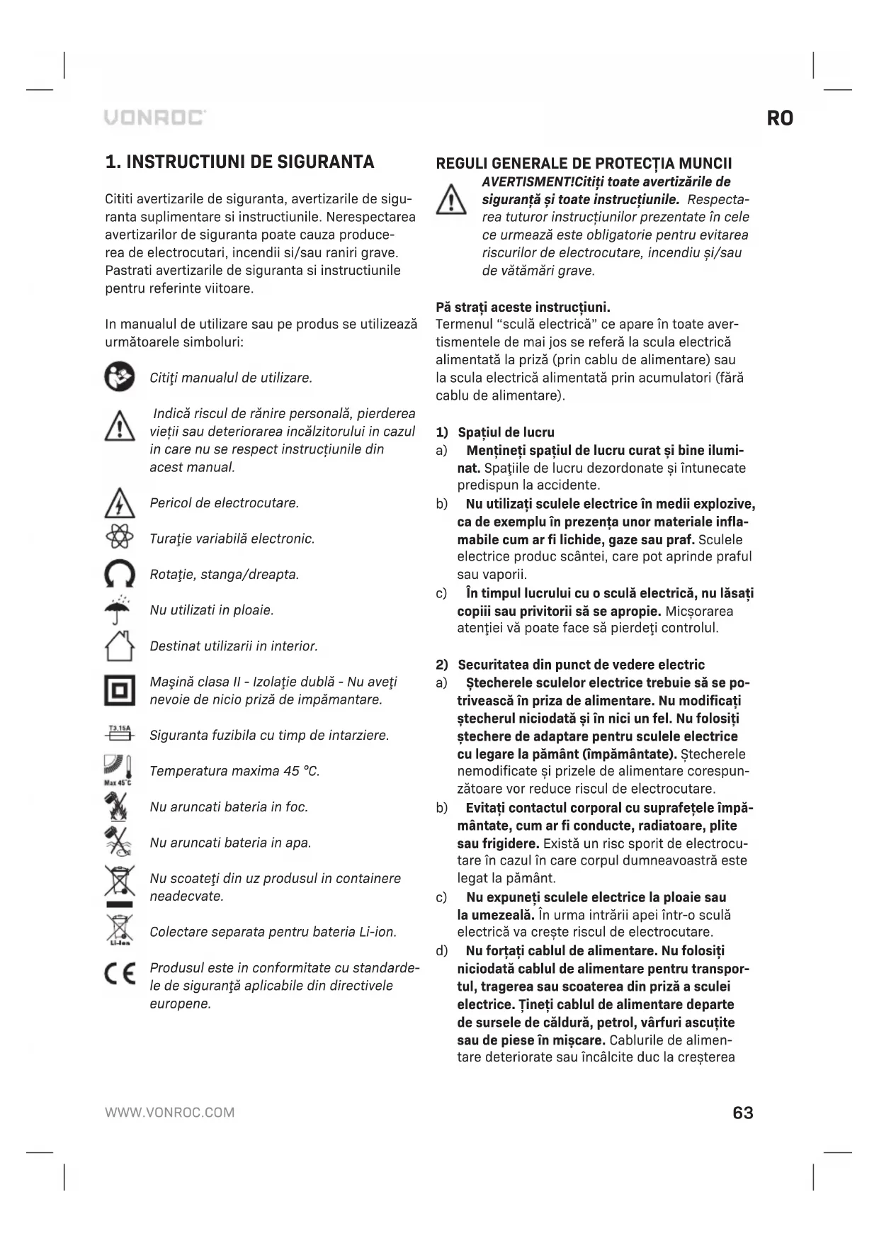 Aparatele electrice sau electronice deteriorate si/sau defecte trebuie colectate în locurile de reciclare corespunzatoare. Numai pentru tarile din CE Nu aruncati echipamentele actionate electric îm- preuna cu gunoiul menajer. Conform Indicatiei eu- ropene 2012/19/EU pentru echipamente electrice si electronice uzate si a implementarii sale la nivel national, echipamentele actionate electric scoase din uz trebuie colectate separat si evacuate într-o maniera ecologica. GARANŢIE Produsele VONROC sunt realizate la cele mai inalte standarde de calitate şi sunt garantate in privinţa materialelor şi a manoperei pentru intreaga perioadă de utilizare in garanţie, incepand cu data achiziţiei. In cazul in care produsul se defectează in timpul perioadei de utilizare, contactaţi direct VONROC. Următoarele circumstanţe sunt excluse de la această garanţie: