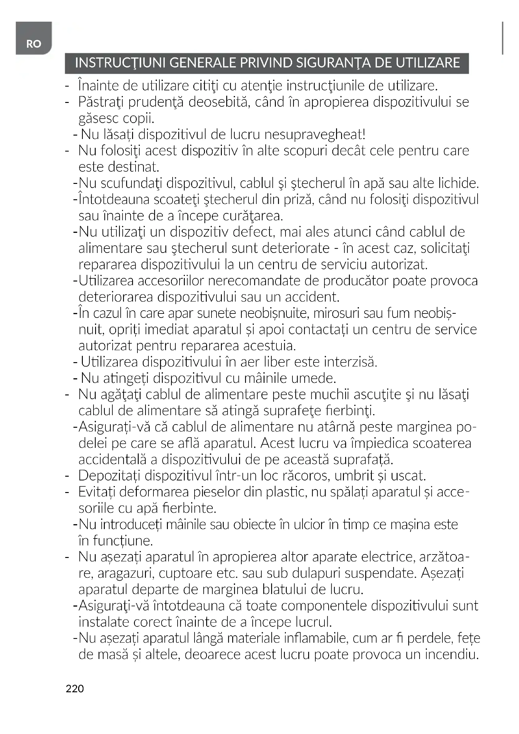 INSTRUCŢIUNI GENERALE PRIVIND SIGURANŢA DE UTILIZARE - Înainte de ulizare ciţi cu atenţie instrucţiunile de ulizare. - Păstraţi prudenţă deosebită, când în apropierea dispozivului se găsesc copii. - Nu lăsați dispozivul de lucru nesupravegheat! - Nu folosiţi acest dispoziv în alte scopuri decât cele pentru care este desnat.