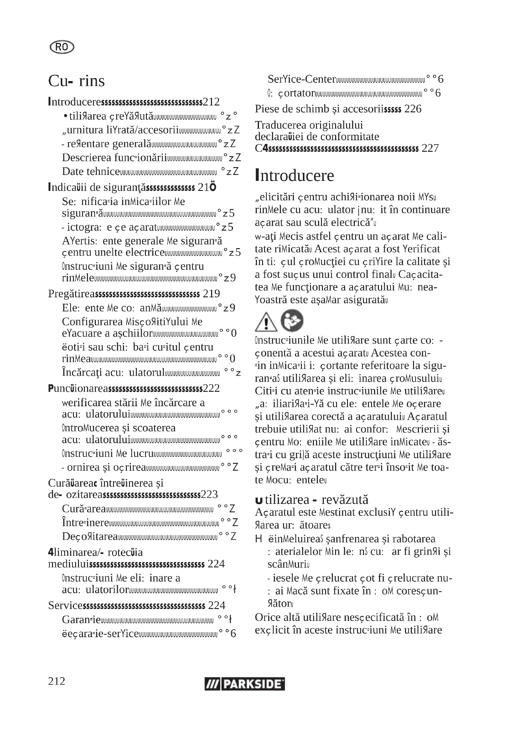 - Traducerea originalului declarației de conformitate CE Introducere Felicitări pentru achiziționarea noii dvs. rindele cu acumulator (numit în continuare aparat sau sculă electrică). V-aţi decis astfel pentru un aparat de cali- tate ridicată. Acest aparat a fost verificat în timpul producţiei cu privire la calitate și a fost supus unui control final. Capacita- tea de funcţionare a aparatului dumnea- voastră este așadar asigurată. Instrucțiunile de utilizare sunt parte com- ponentă a acestui aparat. Acestea con- țin indicații importante referitoare la sigu- ranța, utilizarea și eliminarea produsului. Citiți cu atenție instrucțiunile de utilizare. Familiarizați-vă cu elementele de operare și utilizarea corectă a aparatului. Aparatul trebuie utilizat numai conform descrierii și pentru domeniile de utilizare indicate. Păs- trați cu grijă aceste instrucţiuni de utilizare și predați aparatul către terți însoțit de toa- te documentele. Utilizarea prevăzută Aparatul este destinat exclusiv pentru utili- zarea următoare: p. 227