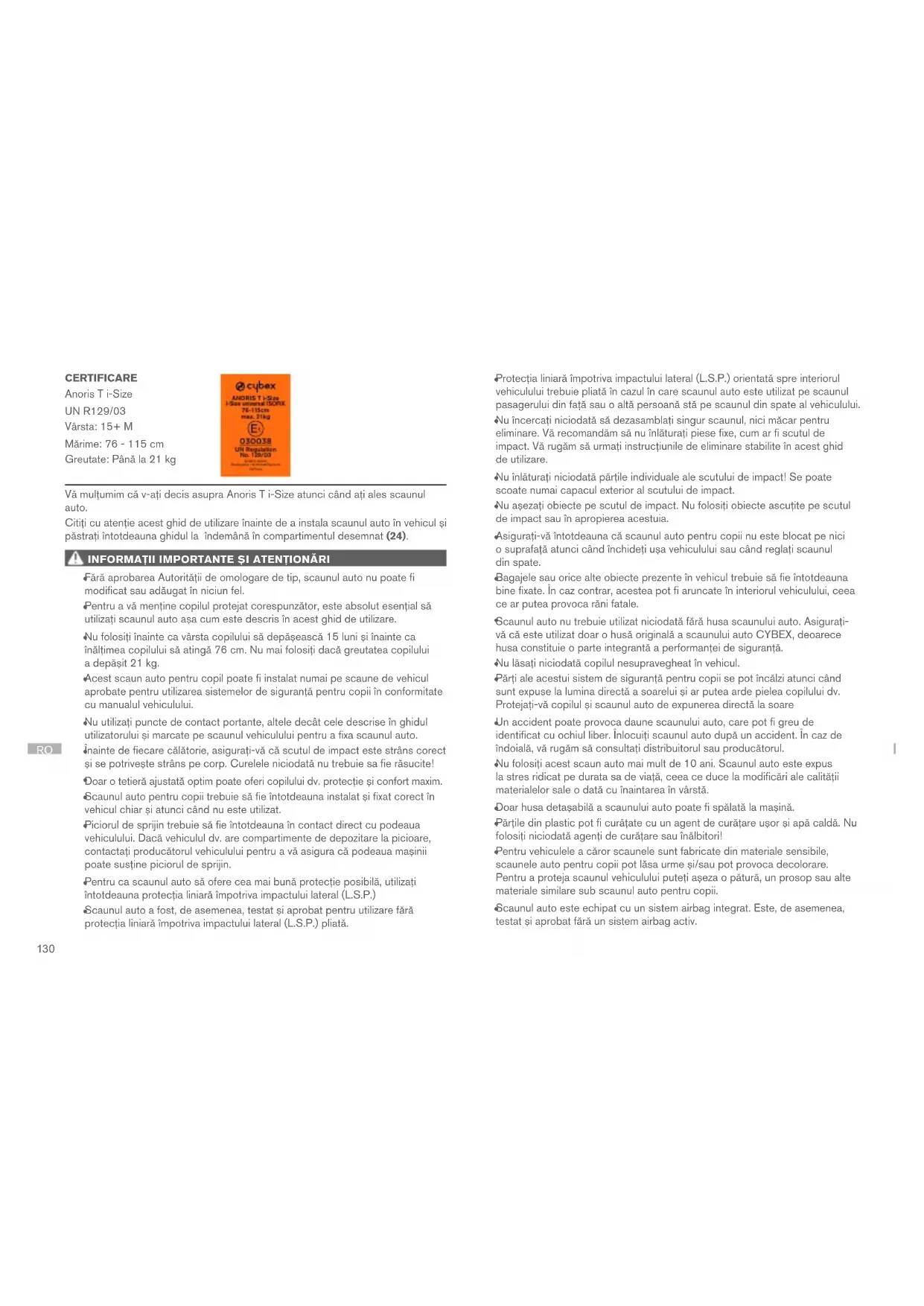 Acesta este un sistem i-Size îmbunătățit de fixare a copilului. Este aprobat în conformitate cu Regulamentul ONU nr. R129 / 03, pentru utilizare în mașini cu scaune compatibile i-Size, așa cum indică producătorii de mașini în manualele de utilizare. Dacă vehiculul dv. nu are o poziție de scaun i-Size, vă rugăm să consultați lista anexată cu tipuri de vehicule pentru a afla dacă utilizarea este permisă. Puteți obține cea mai actualizată versiune a Listei de tipuri de pe www.cybex-online.com Dacă vehiculul dv. nu este echipat cu ISOFIX, scaunul auto nu poate fi utilizat. Dacă vehiculul dv. nu oferă suficient spațiu, protecția liniară împotriva impactului lateral (L.S.P) poate fi pliată. Nu este garantat faptul că toate pozițiile de ședere și înclinare pot fi utilizate în toate vehiculele omologate.