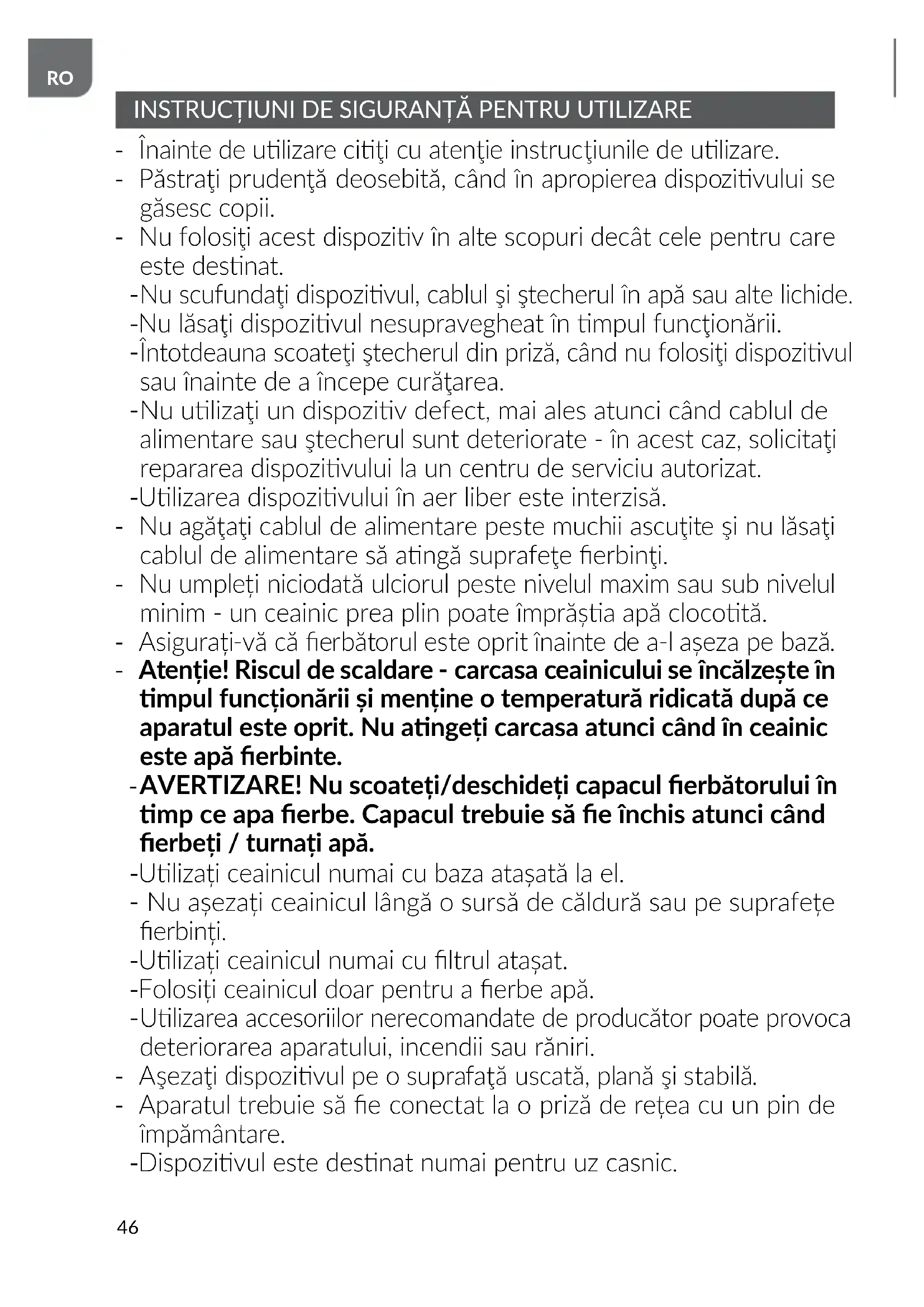 Nu ulizaţi un dispoziv defect, mai ales atunci când cablul de alimentare sau ştecherul sunt deteriorate - în acest caz, solicitaţi repararea dispozivului la un centru de serviciu autorizat. - Ulizarea dispozivului în aer liber este interzisă. - Nu agăţaţi cablul de alimentare peste muchii ascuţite şi nu lăsaţi cablul de alimentare să angă suprafeţe erbinţi. - Nu umpleți niciodată ulciorul peste nivelul maxim sau sub nivelul minim - un ceainic prea plin poate împrășa apă clocotă. - Asigurați-vă că erbătorul este oprit înainte de a-l așeza pe bază. - Atenție! Riscul de scaldare - carcasa ceainicului se încălzește în mpul funcționării și menține o temperatură ridicată după ce aparatul este oprit. Nu angeți carcasa atunci când în ceainic este apă erbinte.