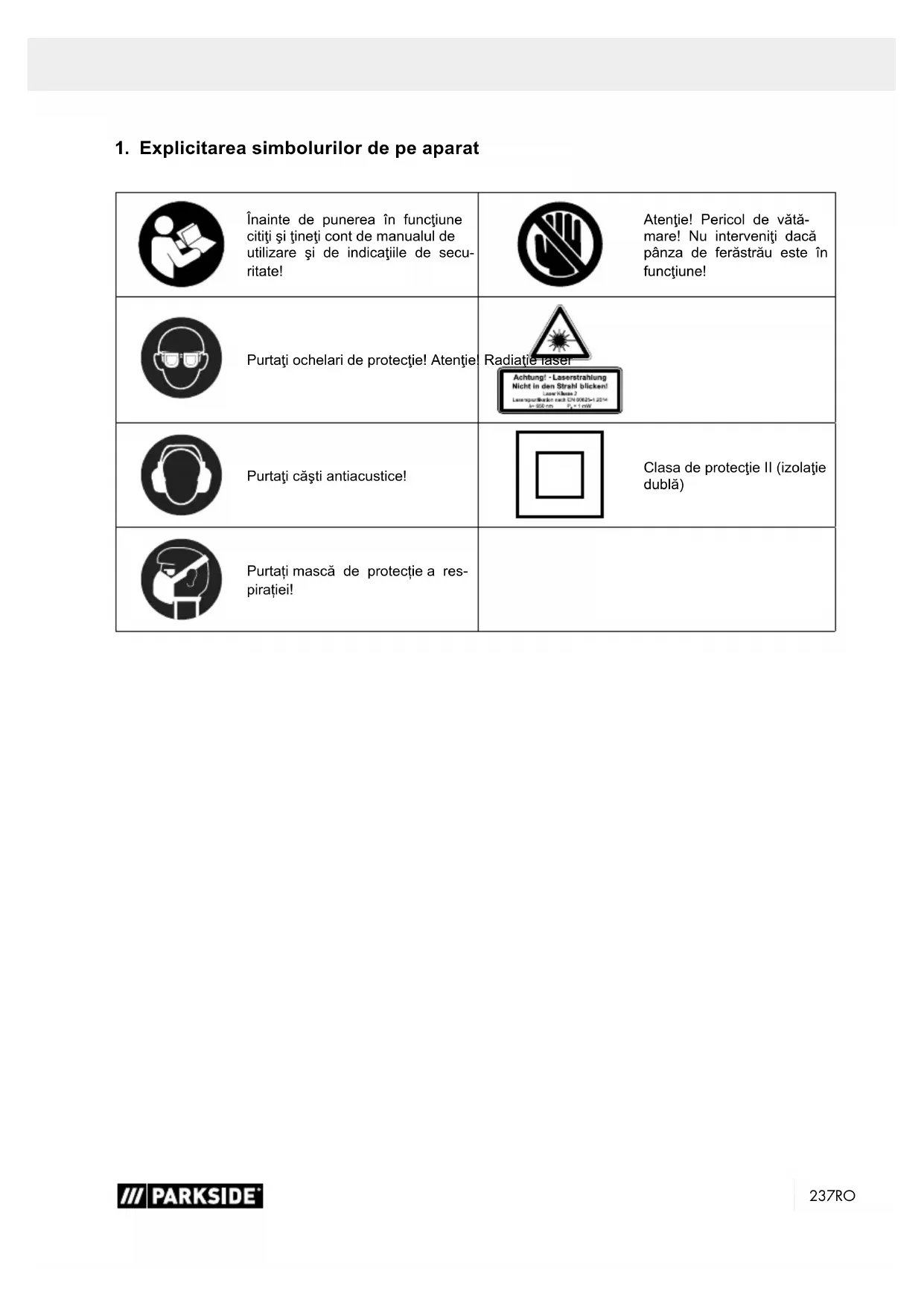 Înainte de punerea în funcţiune citiţi şi ţineţi cont de manualul de utilizare şi de indicaţiile de secu- ritate! Atenţie! Pericol de vătă- mare! Nu interveniţi dacă pânza de ferăstrău este în funcţiune! Purtaţi ochelari de protecţie! Atenţie! Radiaţie laser Purtaţi căşti antiacustice! Clasa de protecţie II (izolaţie dublă) Purtați mască de protecție a res- pirației!238 RO