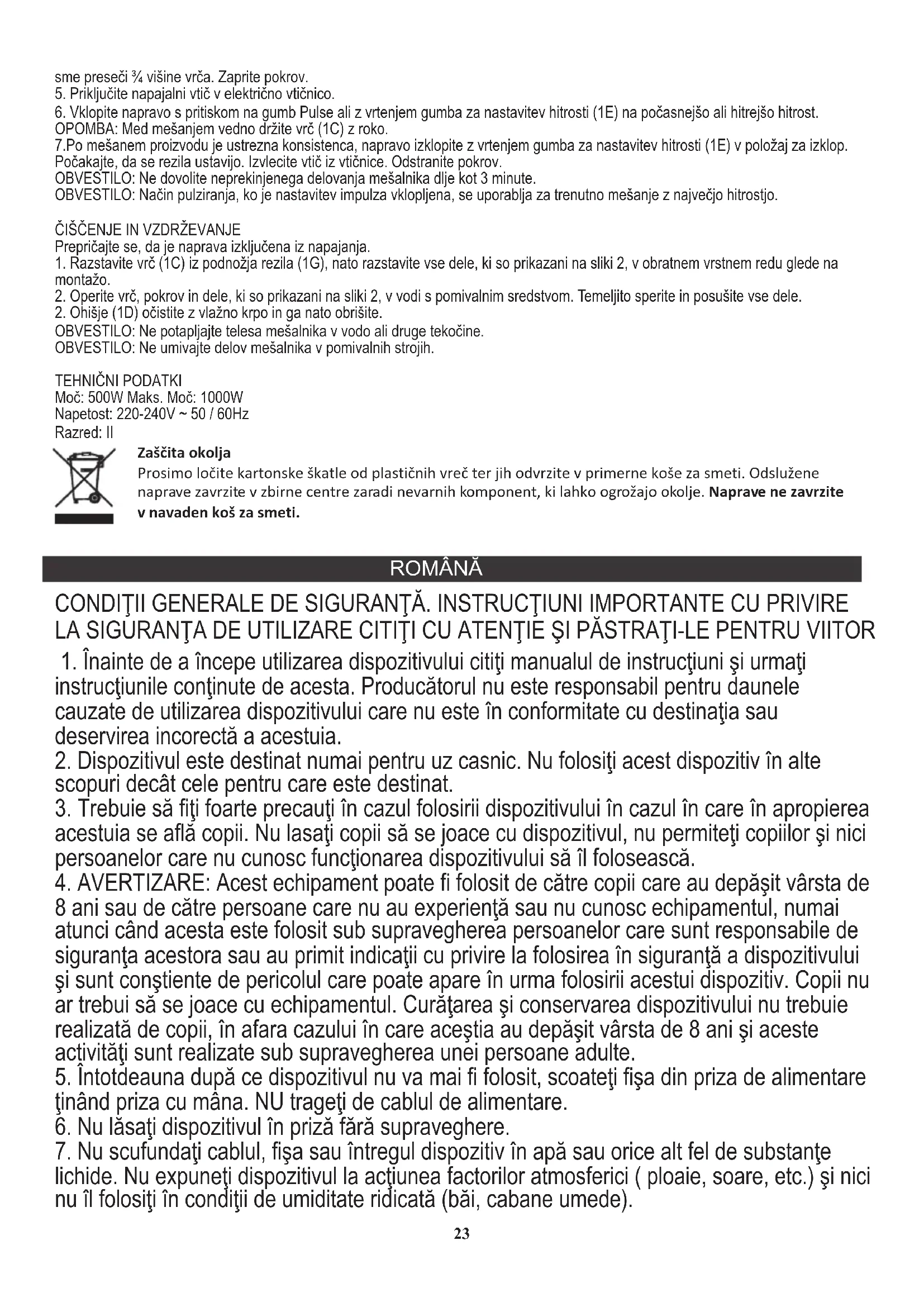 ATENȚIE: Modul de funcționare prin pulsare, atunci când setarea pulsului este comutată, este utilizată pentru o amestecare momentană cu viteza maximă. ANUNȚ: Nu spălați nici un fel de piese de blender în mașinile de spălat vase. 1. Așezați ansamblul lamei (2A) și garnitura (2B) pe baza lamei (2C) și apoi adăugați ambreiajul (2D) din partea inferioară, apoi înșurubați toate părțile strâns prin rotirea în partea stângă până când este ferm loc (Imagine 2). DATE TEHNICE 3. Așezați cana (1C) pe corpul principal (1D), comutatorul de blocare (1A) va ajunge în poziția corectă de funcționare. (Imaginea 1) Putere: 500W Max. Putere: 1000W Tensiune: 220-240V ~ 50 / 60Hz Clasa: II Asigurați-vă că dispozitivul este deconectat de la alimentare. Din grija pentru mediul înconjurător. Ambalajele din carton vă rugăm să le transmiteţi şa centrele de maculatură. Sacii din polietilenă (PE) trebuie aruncate în recipientele pentru materialele plastice. Dispozitivul uzat trebuie transmis la punctul corespunzător de depozitare, deoarece componentele periculoase care se găsesc în dispozitiv pot fi foarte periculoase pentru mediul înconjurător. Dispozitivul electric trebuie transmis în aşa fel încât să se limiteze utilizarea lui repetată. Dacă în dispozitiv se găsesc baterii acestea trebuiesc scoase şi transmise către punctul de depozitare a acestora, separat. OPŠTI USLOVI BEZBJEDNOSTI. VAŽNE UPUTE KOJE SE TIČU BEZBJEDNOSTI UPOTREBE. PROČITAJTE IH PAŽLJIVO I SAČUTOVAJTE KAKO BISTE IH KONSULTOVALI U BUDUĆNOSTI U cilju povećanja bezbjednosti eksploatacije, u jedno strujno kolo se ne može istovremeno priključiti više električnih uređaja.