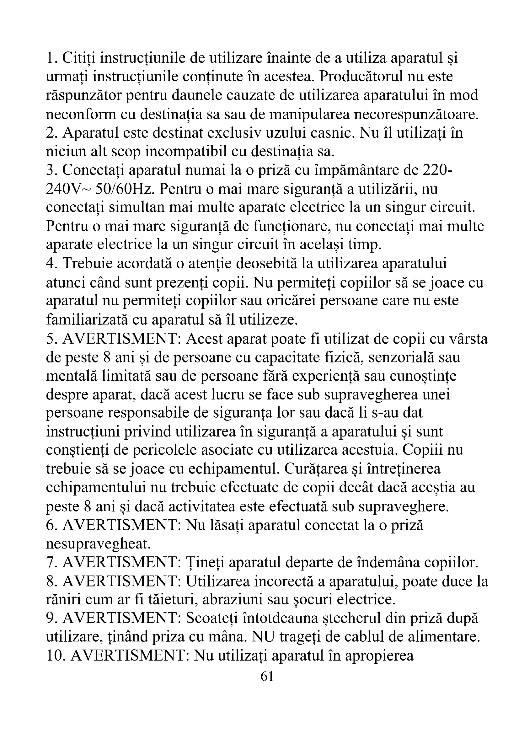 urmați instrucțiunile conținute în acestea. Producătorul nu este răspunzător pentru daunele cauzate de utilizarea aparatului în mod neconform cu destinația sa sau de manipularea necorespunzătoare.