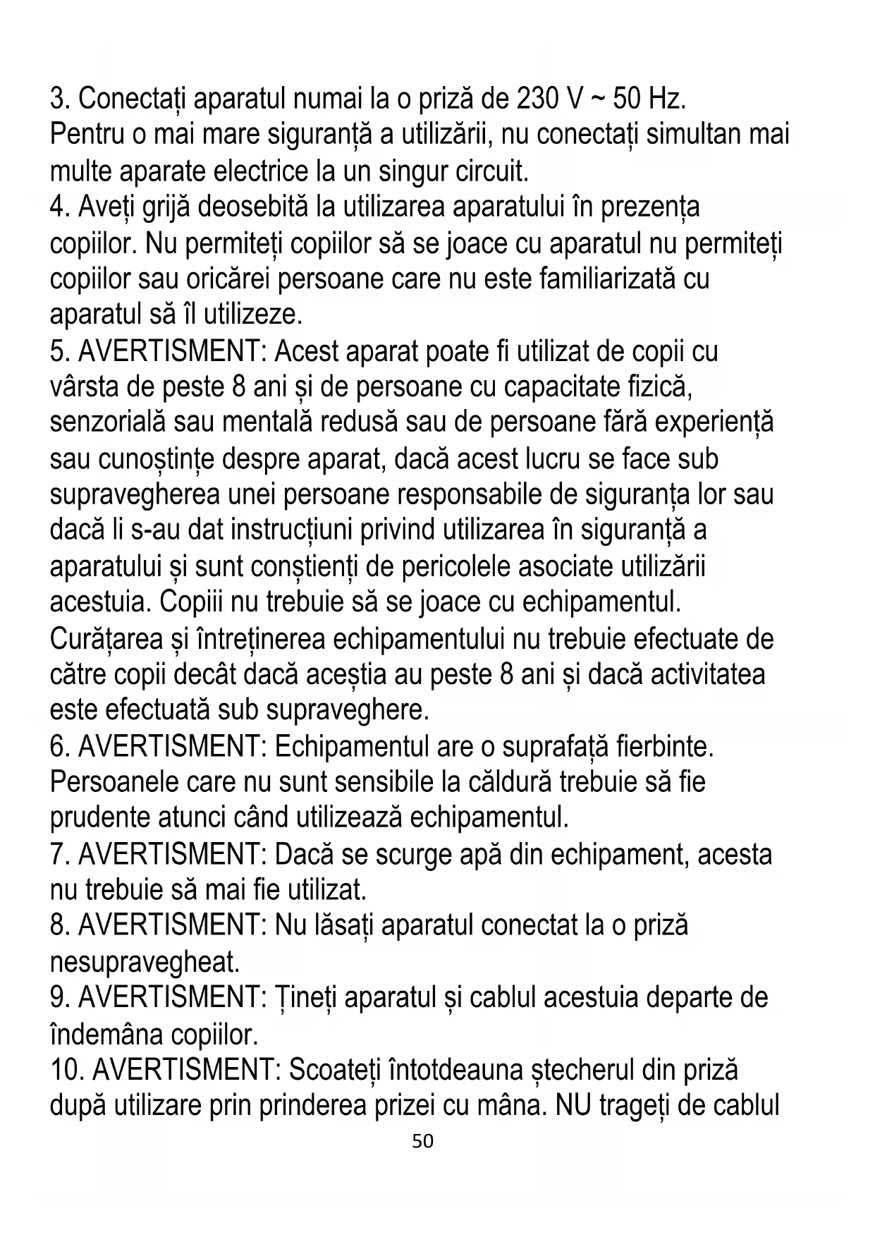 10. AVERTISMENT: Scoateți întotdeauna ștecherul din priză