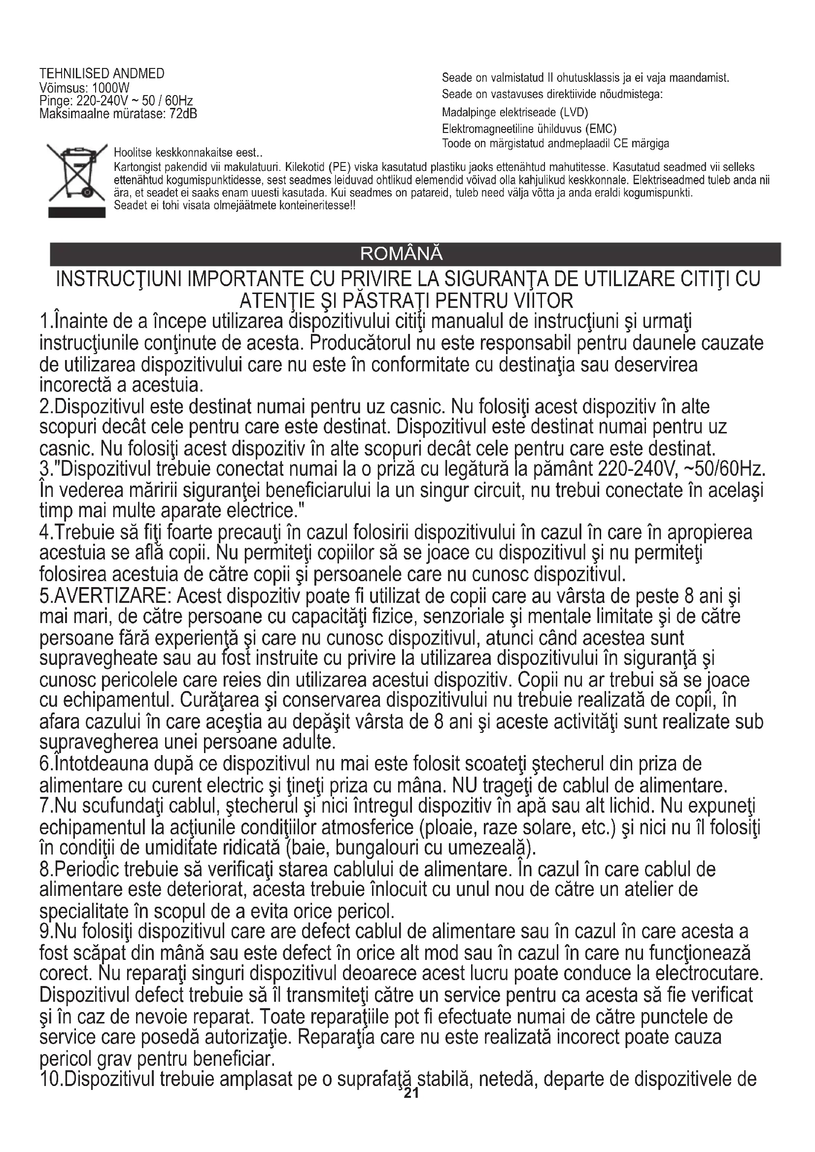 aerosoolpakendites tooteid või manustatakse hapnikku. Töötamisel läheb seade kuumaks. Ärge pange seadet kergestisüttivate materjalide lähedusse.21 Seade on valmistatud II ohutusklassis ja ei vaja maandamist. Seade on vastavuses direktiivide nõudmistega: Madalpinge elektriseade (LVD) Elektromagneetiline ühilduvus (EMC) Toode on märgistatud andmeplaadil CE märgiga Hoolitse keskkonnakaitse eest.. Kartongist pakendid vii makulatuuri. Kilekotid (PE) viska kasutatud plastiku jaoks ettenähtud mahutitesse. Kasutatud seadmed vii selleks ettenähtud kogumispunktidesse, sest seadmes leiduvad ohtlikud elemendid võivad olla kahjulikud keskkonnale. Elektriseadmed tuleb anda nii ära, et seadet ei saaks enam uuesti kasutada. Kui seadmes on patareid, tuleb need välja võtta ja anda eraldi kogumispunkti. Seadet ei tohi visata olmejäätmete konteineritesse!! ROMÂNĂ INSTRUCŢIUNI IMPORTANTE CU PRIVIRE LA SIGURANŢA DE UTILIZARE CITIŢI CU ATENŢIE ŞI PĂSTRAŢI PENTRU VIITOR 1.Înainte de a începe utilizarea dispozitivului citiţi manualul de instrucţiuni şi urmaţi instrucţiunile conţinute de acesta. Producătorul nu este responsabil pentru daunele cauzate de utilizarea dispozitivului care nu este în conformitate cu destinaţia sau deservirea incorectă a acestuia. 2.Dispozitivul este destinat numai pentru uz casnic. Nu folosiţi acest dispozitiv în alte scopuri decât cele pentru care este destinat. Dispozitivul este destinat numai pentru uz casnic. Nu folosiţi acest dispozitiv în alte scopuri decât cele pentru care este destinat. 3."Dispozitivul trebuie conectat numai la o priză cu legătură la pământ 220-240V, ~50/60Hz. În vederea măririi siguranţei beneficiarului la un singur circuit, nu trebui conectate în acelaşi timp mai multe aparate electrice." 4.Trebuie să fiţi foarte precauţi în cazul folosirii dispozitivului în cazul în care în apropierea acestuia se află copii. Nu permiteţi copiilor să se joace cu dispozitivul şi nu permiteţi folosirea acestuia de către copii şi persoanele care nu cunosc dispozitivul. 5.AVERTIZARE: Acest dispozitiv poate fi utilizat de copii care au vârsta de peste 8 ani şi mai mari, de către persoane cu capacităţi fizice, senzoriale şi mentale limitate şi de către persoane fără experienţă şi care nu cunosc dispozitivul, atunci când acestea sunt supravegheate sau au fost instruite cu privire la utilizarea dispozitivului în siguranţă şi cunosc pericolele care reies din utilizarea acestui dispozitiv. Copii nu ar trebui să se joace cu echipamentul. Curăţarea şi conservarea dispozitivului nu trebuie realizată de copii, în afara cazului în care aceştia au depăşit vârsta de 8 ani şi aceste activităţi sunt realizate sub supravegherea unei persoane adulte. 6.Întotdeauna după ce dispozitivul nu mai este folosit scoateţi ştecherul din priza de alimentare cu curent electric şi ţineţi priza cu mâna. NU trageţi de cablul de alimentare. 7.Nu scufundaţi cablul, ştecherul şi nici întregul dispozitiv în apă sau alt lichid. Nu expuneţi echipamentul la acţiunile condiţiilor atmosferice (ploaie, raze solare, etc.) şi nici nu îl folosiţi în condiţii de umiditate ridicată (baie, bungalouri cu umezeală). 8.Periodic trebuie să verificaţi starea cablului de alimentare. În cazul în care cablul de alimentare este deteriorat, acesta trebuie înlocuit cu unul nou de către un atelier de specialitate în scopul de a evita orice pericol. 9.Nu folosiţi dispozitivul care are defect cablul de alimentare sau în cazul în care acesta a fost scăpat din mână sau este defect în orice alt mod sau în cazul în care nu funcţionează corect. Nu reparaţi singuri dispozitivul deoarece acest lucru poate conduce la electrocutare. Dispozitivul defect trebuie să îl transmiteţi către un service pentru ca acesta să fie verificat şi în caz de nevoie reparat. Toate reparaţiile pot fi efectuate numai de către punctele de service care posedă autorizaţie. Reparaţia care nu este realizată incorect poate cauza pericol grav pentru beneficiar. 10.Dispozitivul trebuie amplasat pe o suprafaţă stabilă, netedă, departe de dispozitivele de TEHNILISED ANDMED Võimsus: 1000W Pinge: 220-240V ~ 50 / 60Hz Maksimaalne müratase: 72dB22