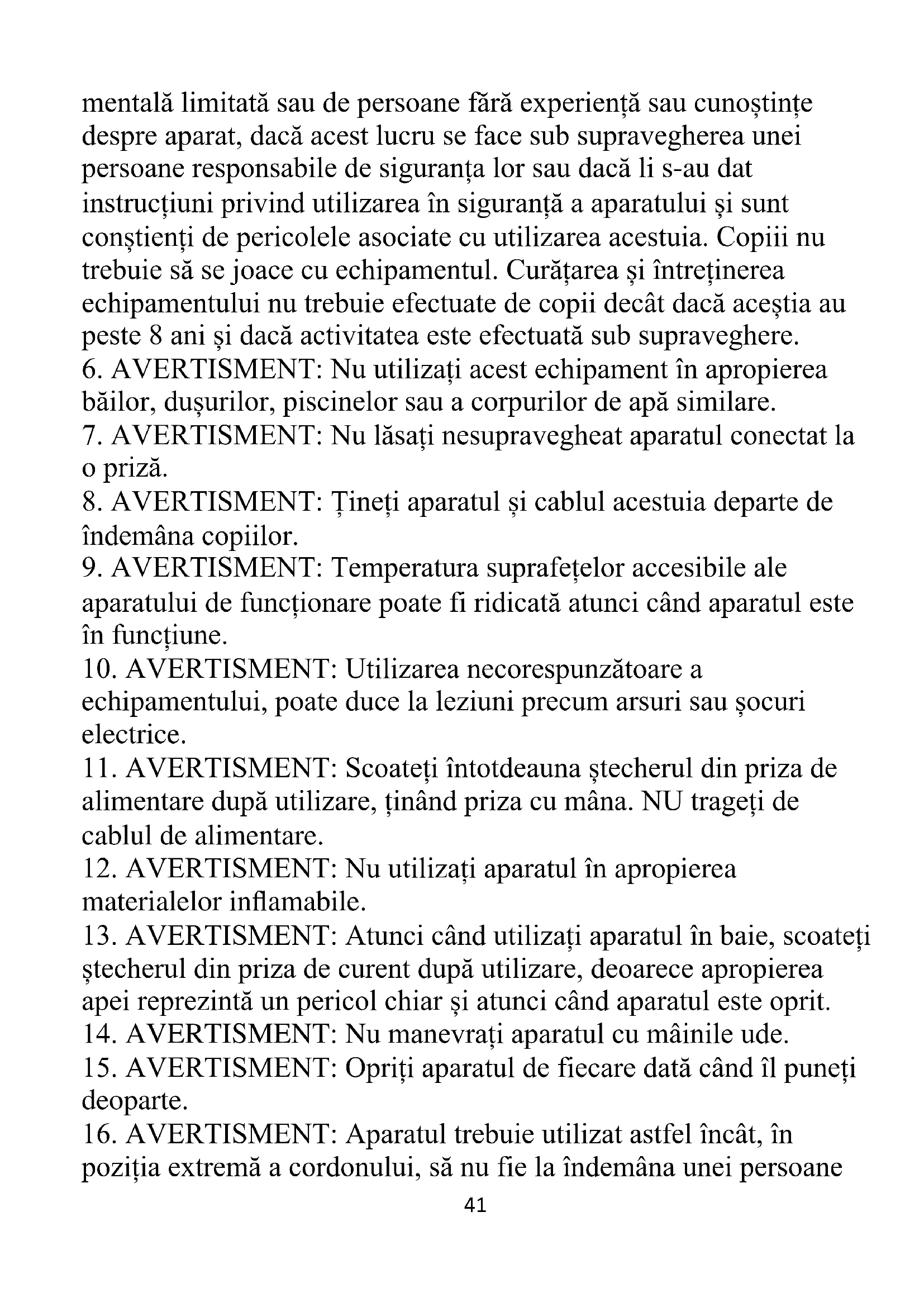 16. AVERTISMENT: Aparatul trebuie utilizat astfel încât, în