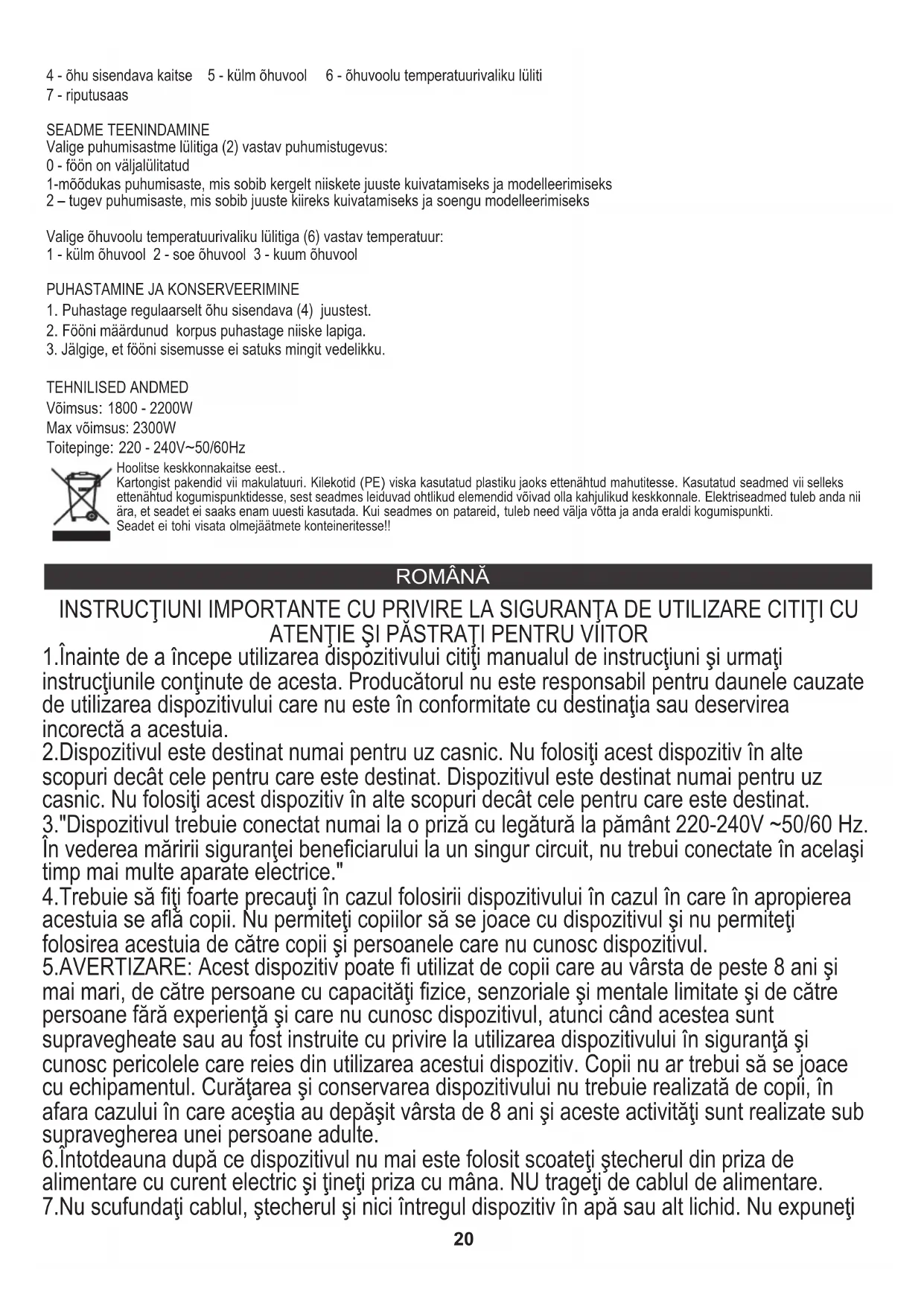 ROMÂNĂ 2.Dispozitivul este destinat numai pentru uz casnic. Nu folosiţi acest dispozitiv în alte scopuri decât cele pentru care este destinat. Dispozitivul este destinat numai pentru uz casnic. Nu folosiţi acest dispozitiv în alte scopuri decât cele pentru care este destinat. 4.Trebuie să fiţi foarte precauţi în cazul folosirii dispozitivului în cazul în care în apropierea acestuia se află copii. Nu permiteţi copiilor să se joace cu dispozitivul şi nu permiteţi folosirea acestuia de către copii şi persoanele care nu cunosc dispozitivul. În vederea măririi siguranţei beneficiarului la un singur circuit, nu trebui conectate în acelaşi timp mai multe aparate electrice." 3."Dispozitivul trebuie conectat numai la o priză cu legătură la pământ 220-240V ~50/60 Hz. 1.Înainte de a începe utilizarea dispozitivului citiţi manualul de instrucţiuni şi urmaţi instrucţiunile conţinute de acesta. Producătorul nu este responsabil pentru daunele cauzate de utilizarea dispozitivului care nu este în conformitate cu destinaţia sau deservirea incorectă a acestuia. 5.AVERTIZARE: Acest dispozitiv poate fi utilizat de copii care au vârsta de peste 8 ani şi mai mari, de către persoane cu capacităţi fizice, senzoriale şi mentale limitate şi de către persoane fără experienţă şi care nu cunosc dispozitivul, atunci când acestea sunt supravegheate sau au fost instruite cu privire la utilizarea dispozitivului în siguranţă şi cunosc pericolele care reies din utilizarea acestui dispozitiv. Copii nu ar trebui să se joace cu echipamentul. Curăţarea şi conservarea dispozitivului nu trebuie realizată de copii, în afara cazului în care aceştia au depăşit vârsta de 8 ani şi aceste activităţi sunt realizate sub supravegherea unei persoane adulte. INSTRUCŢIUNI IMPORTANTE CU PRIVIRE LA SIGURANŢA DE UTILIZARE CITIŢI CU ATENŢIE ŞI PĂSTRAŢI PENTRU VIITOR 6.Întotdeauna după ce dispozitivul nu mai este folosit scoateţi ştecherul din priza de alimentare cu curent electric şi ţineţi priza cu mâna. NU trageţi de cablul de alimentare. 7.Nu scufundaţi cablul, ştecherul şi nici întregul dispozitiv în apă sau alt lichid. Nu expuneţi21 11.Nu folosiţi dispozitivul în apropierea materialelor combustibile.