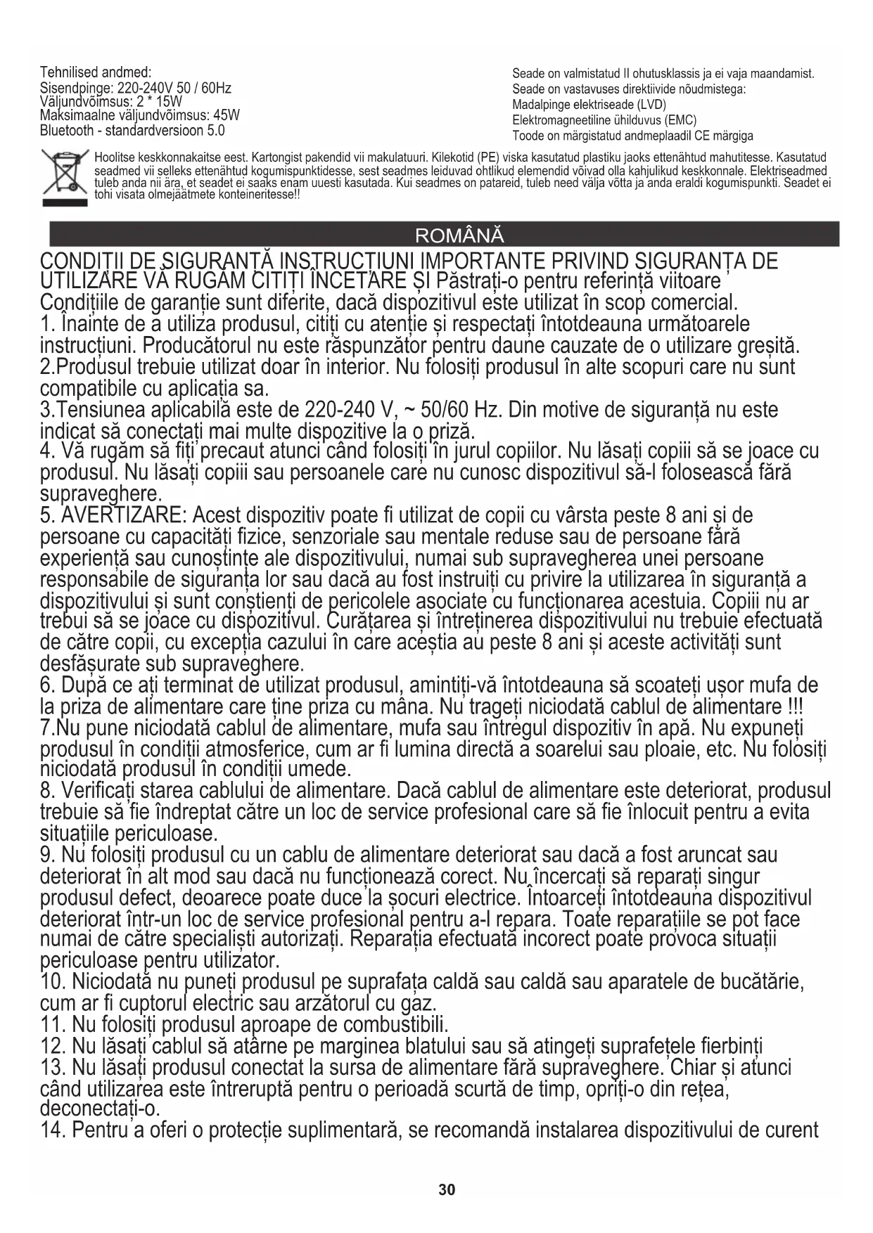 Date tehnice: Tensiune de intrare: 220-240V 50 / 60Hz Putere de iesire: 2 * 15W Putere maximă de ieșire: 45W Bluetooth - versiunea standard 5.0 Din grija pentru mediul înconjurător. Ambalajele din carton vă rugăm să le transmiteţi şa centrele de maculatură.Sacii din polietilenă (PE) trebuie aruncate în recipientele pentru materialele plastice. Dispozitivul uzat trebuie transmis la punctul corespunzător de depozitare, deoarece componentele periculoase care se găsesc în dispozitiv pot fi foarte periculoase pentru mediul înconjurător. Dispozitivul electric trebuie transmis în aşa fel încât să se limiteze utilizarea lui repetată. Dacă în dispozitiv se găsesc baterii acestea trebuiesc scoase şi transmise către punctul de depozitare a acestora, separat. Dispozitivul este fabricat în clasa II de izolare.. Dispozitivul este în conformitate cu cerinţele directivelor: Dispozitiv electric de joasă tensiune (LVD) Compatibilitate electromagnetică (EMC) Produs marcat cu simbolul CE pe plăcuţa de fabricaţie (BS) BOSANSKI SIGURNOSNI UVJETI VAŽNE UPUTE O SIGURNOSTI KORIŠTENJA MOLIMO VASNO