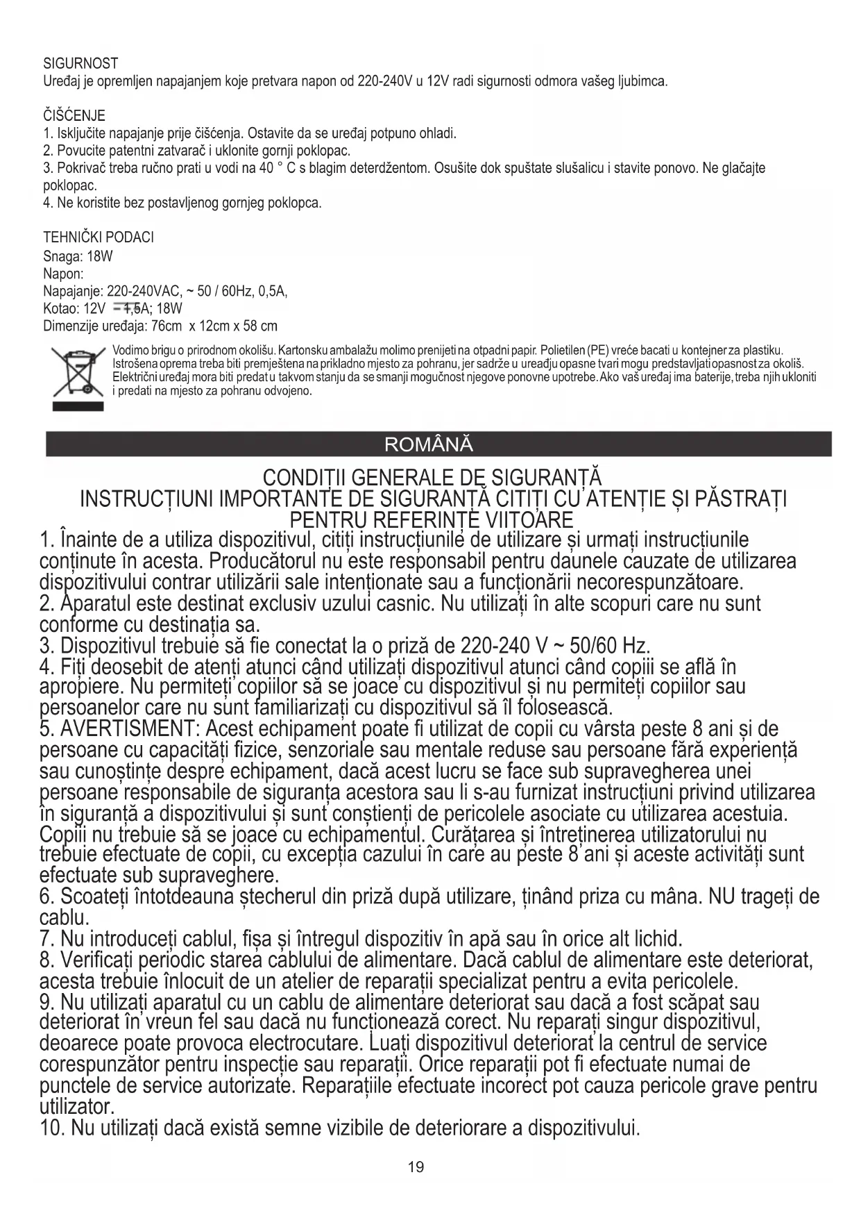 SECURITATE Dispozitivul este echipat cu o sursă de alimentare care convertește tensiunea de la 220-240V la 12V pentru siguranța odihnei animalului de companie. CURĂȚAREA