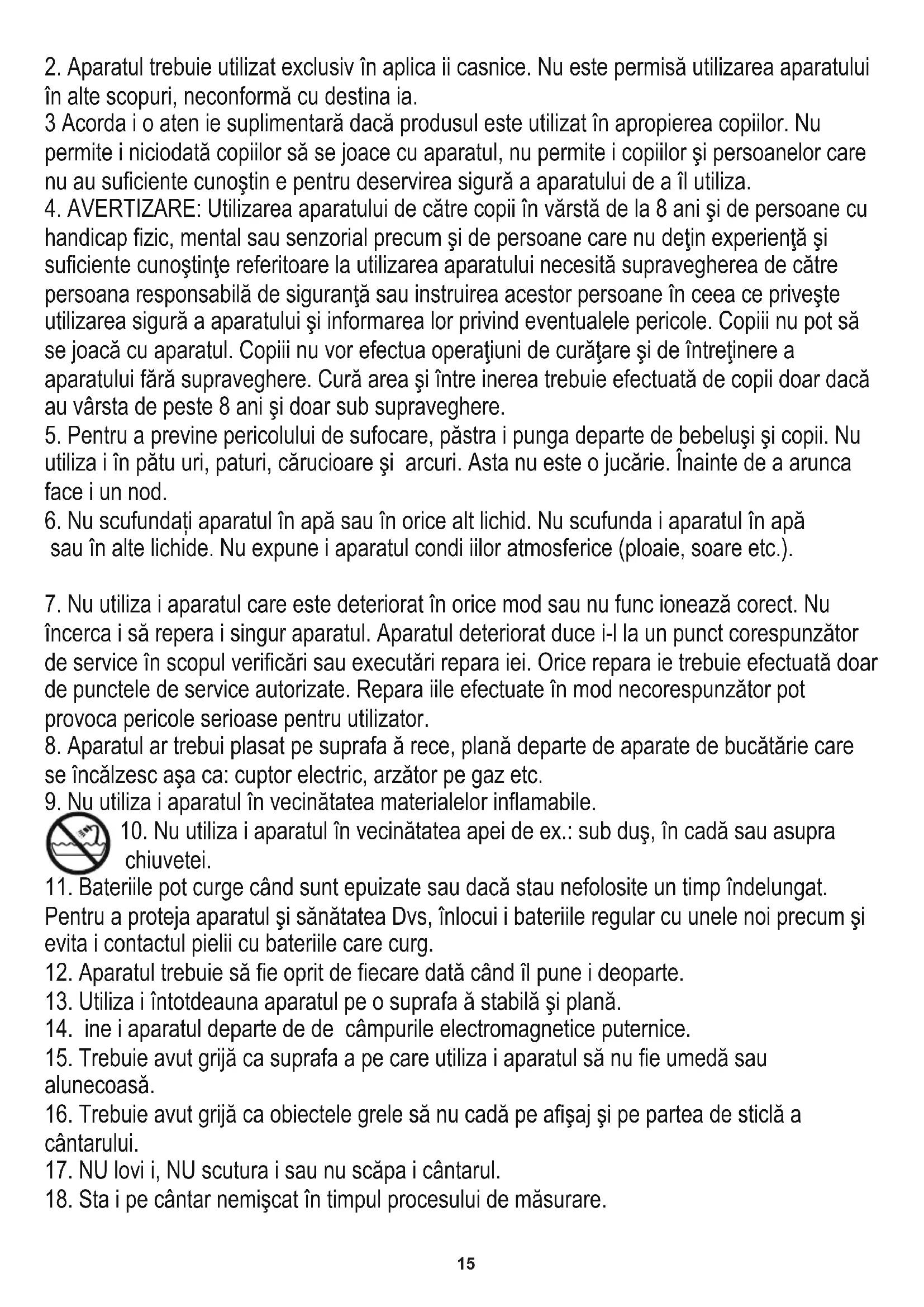 15. Trebuie avut grijă ca suprafa a pe care utiliza i aparatul să nu fie umedă sau