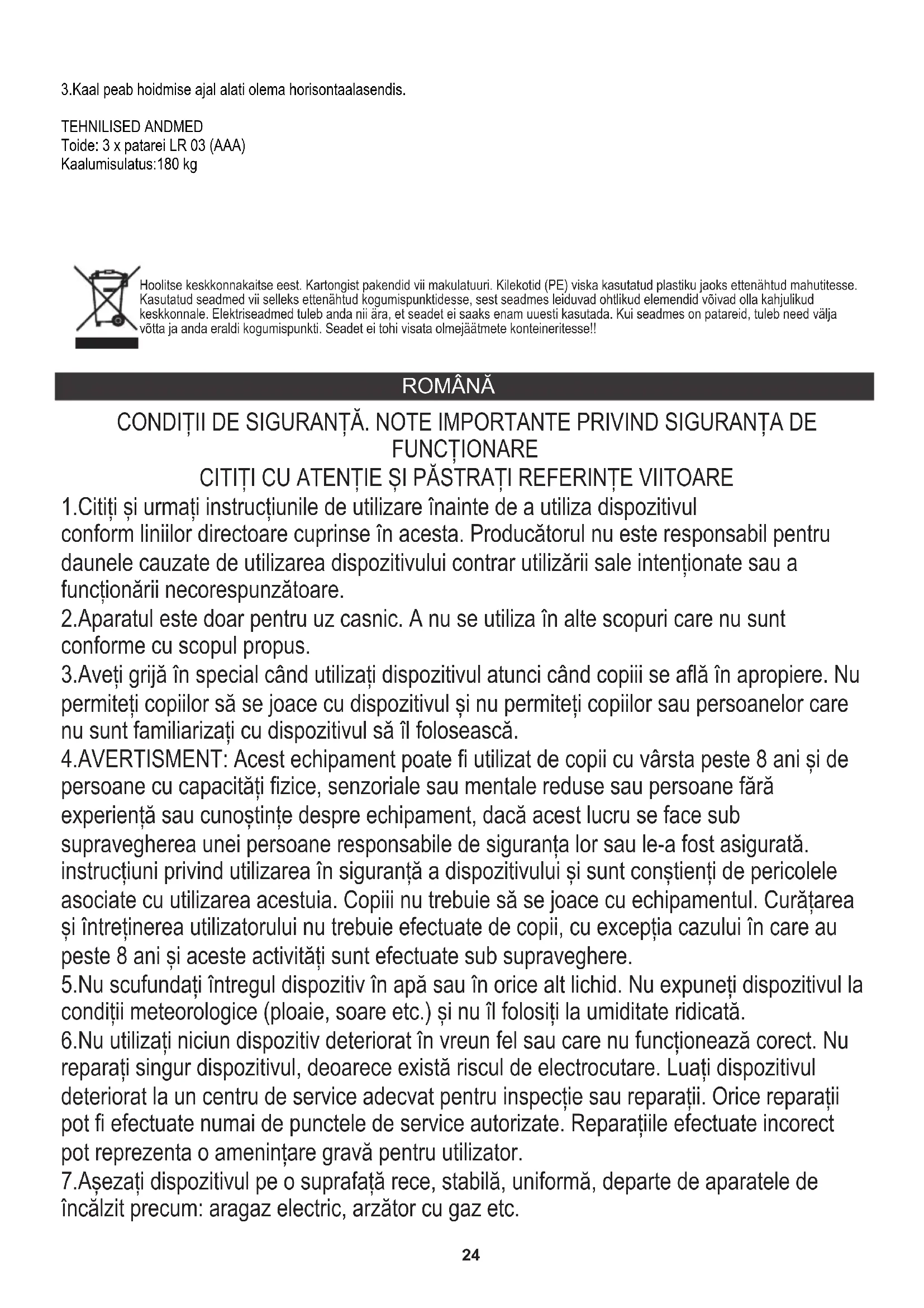 Ühikud, milles kaalumistulemust näidatakse, saate vahetada nupu abil, mis paikneb kaalu all patareipesa või patareihoidiku kõrval. Võimalikud kaaluühikud: kilod (kg) ja naelad (lb).24 3.Kaal peab hoidmise ajal alati olema horisontaalasendis. Kaalumisulatus:180 kg Toide: 3 x patarei LR 03 (AAA) TEHNILISED ANDMED Hoolitse keskkonnakaitse eest. Kartongist pakendid vii makulatuuri. Kilekotid (PE) viska kasutatud plastiku jaoks ettenähtud mahutitesse. Kasutatud seadmed vii selleks ettenähtud kogumispunktidesse, sest seadmes leiduvad ohtlikud elemendid võivad olla kahjulikud keskkonnale. Elektriseadmed tuleb anda nii ära, et seadet ei saaks enam uuesti kasutada. Kui seadmes on patareid, tuleb need välja võtta ja anda eraldi kogumispunkti. Seadet ei tohi visata olmejäätmete konteineritesse!! ROMÂNĂ 7.Așezați dispozitivul pe o suprafață rece, stabilă, uniformă, departe de aparatele de încălzit precum: aragaz electric, arzător cu gaz etc. CONDIȚII DE SIGURANȚĂ. NOTE IMPORTANTE PRIVIND SIGURANȚA DE FUNCȚIONARE CITIȚI CU ATENȚIE ȘI PĂSTRAȚI REFERINȚE VIITOARE conform liniilor directoare cuprinse în acesta. Producătorul nu este responsabil pentru daunele cauzate de utilizarea dispozitivului contrar utilizării sale intenționate sau a funcționării necorespunzătoare. 3.Aveți grijă în special când utilizați dispozitivul atunci când copiii se află în apropiere. Nu permiteți copiilor să se joace cu dispozitivul și nu permiteți copiilor sau persoanelor care nu sunt familiarizați cu dispozitivul să îl folosească. 4.AVERTISMENT: Acest echipament poate fi utilizat de copii cu vârsta peste 8 ani și de persoane cu capacități fizice, senzoriale sau mentale reduse sau persoane fără experiență sau cunoștințe despre echipament, dacă acest lucru se face sub supravegherea unei persoane responsabile de siguranța lor sau le-a fost asigurată. instrucțiuni privind utilizarea în siguranță a dispozitivului și sunt conștienți de pericolele asociate cu utilizarea acestuia. Copiii nu trebuie să se joace cu echipamentul. Curățarea și întreținerea utilizatorului nu trebuie efectuate de copii, cu excepția cazului în care au peste 8 ani și aceste activități sunt efectuate sub supraveghere. 1.Citiți și urmați instrucțiunile de utilizare înainte de a utiliza dispozitivul 5.Nu scufundați întregul dispozitiv în apă sau în orice alt lichid. Nu expuneți dispozitivul la condiții meteorologice (ploaie, soare etc.) și nu îl folosiți la umiditate ridicată. 6.Nu utilizați niciun dispozitiv deteriorat în vreun fel sau care nu funcționează corect. Nu reparați singur dispozitivul, deoarece există riscul de electrocutare. Luați dispozitivul deteriorat la un centru de service adecvat pentru inspecție sau reparații. Orice reparații pot fi efectuate numai de punctele de service autorizate. Reparațiile efectuate incorect pot reprezenta o amenințare gravă pentru utilizator. 2.Aparatul este doar pentru uz casnic. A nu se utiliza în alte scopuri care nu sunt conforme cu scopul propus.25 9.Nu utilizați dispozitivul lângă apă, de ex. la dus, 8.Nu utilizați dispozitivul lângă materiale inflamabile. într-o cadă sau peste o chiuvetă. DESCRIEREA DISPOZITIVULUI (Figura A) 10.Nu manipulați dispozitivul cu mâinile ude.
