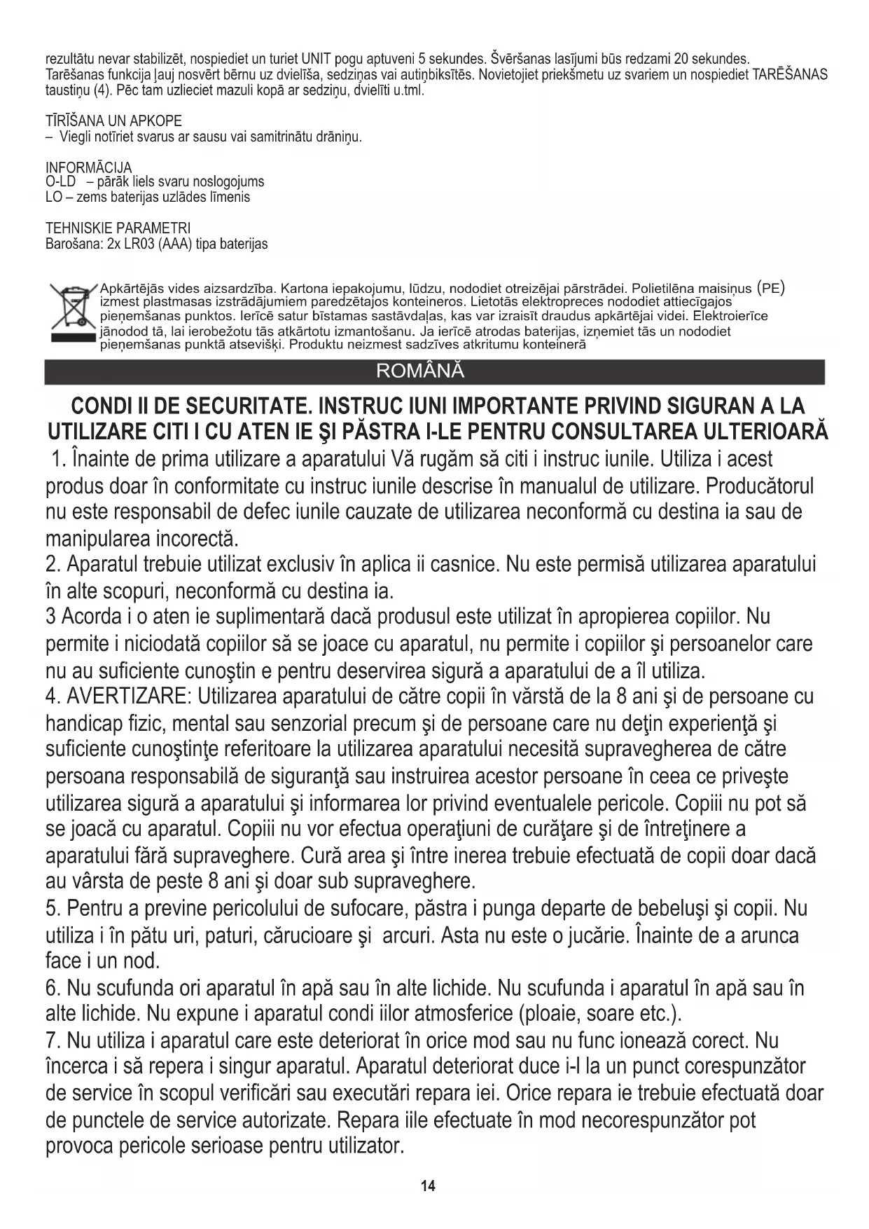 DATE TEHNICE O-LD – o însărcinare prea mare a cântarului Porniţi cântarul cu ajutorul butonului ON/OFF (4). Schimbaţi unităţile de măsură cu ajutorul butonului UNIT (2). Unitatea de măsură va fi vizibilă pe display. LO – nivelul scăzut de încărcare a bateriilor Puneţi cu grijă copilul pe suprafaţa de cântărire (1). Aşteptaţi o clipă până ce rezultatul se va stabiliza. Dacă copilul se mișcă tot timpul și rezultatul nu poate fi stabilizat, apăsați și țineți apăsat butonul UNIT timp de aproximativ 5 secunde. Rezultatul cântăririi va fi redat timp de 20 secunde. Alimentare: baterie de tip 2x LR03 (AAA) Introduceţi bateriile corespunzătaore în lăcaşul pentru baterii (Vezi „înlocuirea bateriilor”)