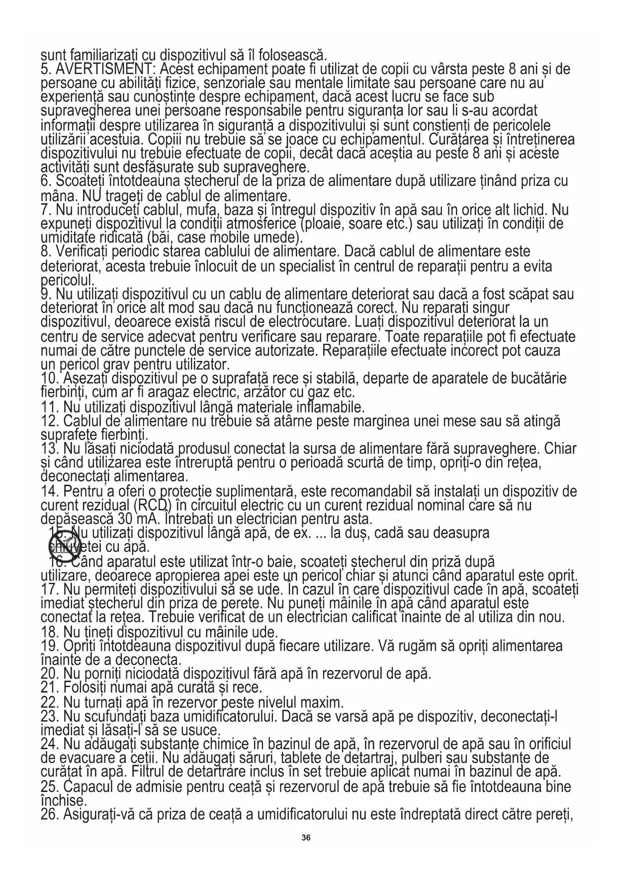 36. În timpul funcționării prelungite a dispozitivului, ceața de apă emisă de umidificator poate