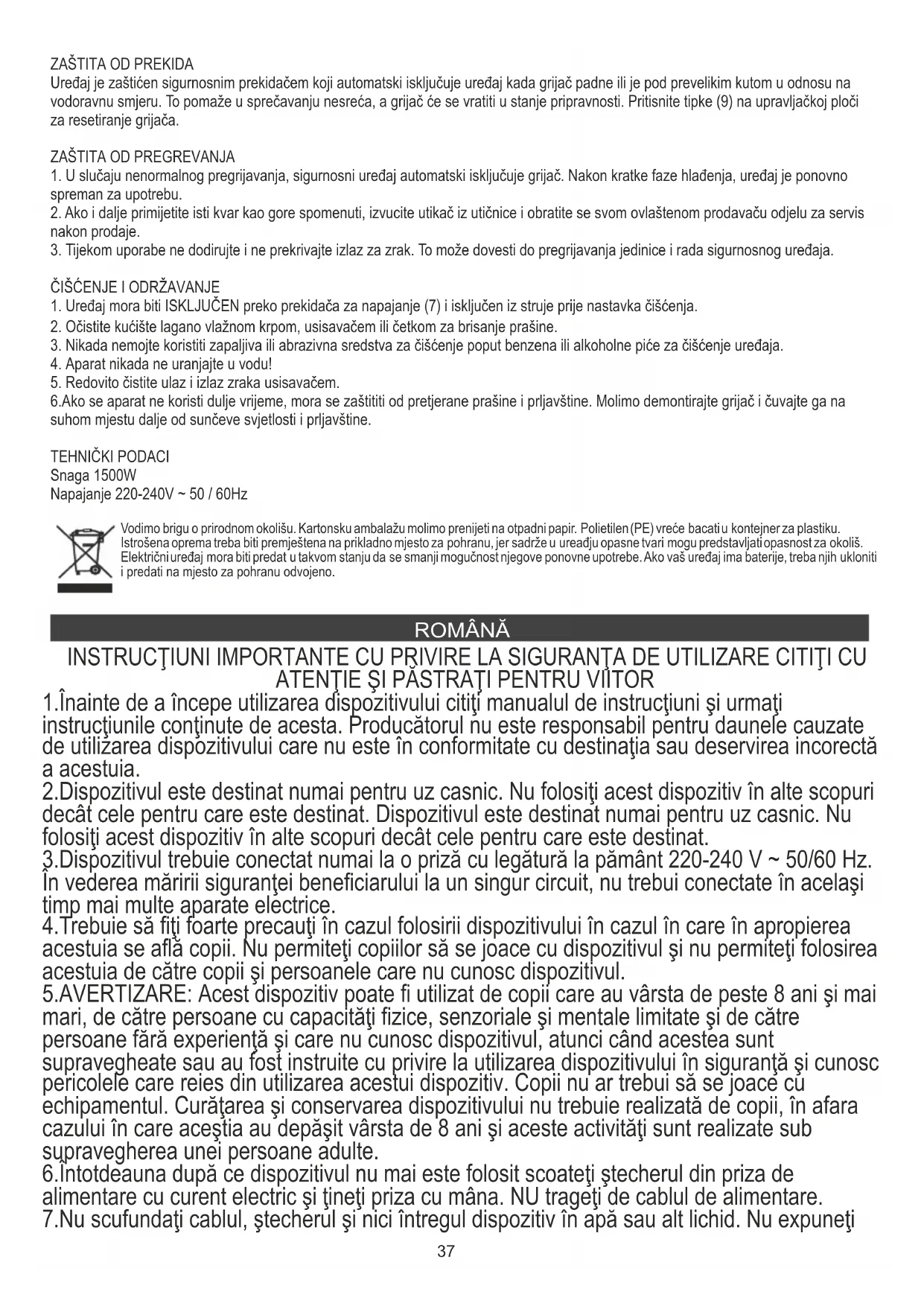 Vodimo brigu o prirodnom okolišu. Kartonsku ambalažu molimo prenijeti na otpadni papir. Polietilen (PE) vreće bacati u kontejner za plastiku. Istrošena oprema treba biti premještena na prikladno mjesto za pohranu, jer sadrže u ureađju opasne tvari mogu predstavljati opasnost za okoliš. Električni uređaj mora biti predat u takvom stanju da se smanji mogučnost njegove ponovne upotrebe. Ako vaš uređaj ima baterije, treba njih ukloniti i predati na mjesto za pohranu odvojeno. ROMÂNĂ INSTRUCŢIUNI IMPORTANTE CU PRIVIRE LA SIGURANŢA DE UTILIZARE CITIŢI CU ATENŢIE ŞI PĂSTRAŢI PENTRU VIITOR 1.Înainte de a începe utilizarea dispozitivului citiţi manualul de instrucţiuni şi urmaţi instrucţiunile conţinute de acesta. Producătorul nu este responsabil pentru daunele cauzate de utilizarea dispozitivului care nu este în conformitate cu destinaţia sau deservirea incorectă a acestuia. 2.Dispozitivul este destinat numai pentru uz casnic. Nu folosiţi acest dispozitiv în alte scopuri decât cele pentru care este destinat. Dispozitivul este destinat numai pentru uz casnic. Nu folosiţi acest dispozitiv în alte scopuri decât cele pentru care este destinat. 3.Dispozitivul trebuie conectat numai la o priză cu legătură la pământ 220-240 V ~ 50/60 Hz. În vederea măririi siguranţei beneficiarului la un singur circuit, nu trebui conectate în acelaşi timp mai multe aparate electrice. 4.Trebuie să fiţi foarte precauţi în cazul folosirii dispozitivului în cazul în care în apropierea acestuia se află copii. Nu permiteţi copiilor să se joace cu dispozitivul şi nu permiteţi folosirea acestuia de către copii şi persoanele care nu cunosc dispozitivul. 5.AVERTIZARE: Acest dispozitiv poate fi utilizat de copii care au vârsta de peste 8 ani şi mai mari, de către persoane cu capacităţi fizice, senzoriale şi mentale limitate şi de către persoane fără experienţă şi care nu cunosc dispozitivul, atunci când acestea sunt supravegheate sau au fost instruite cu privire la utilizarea dispozitivului în siguranţă şi cunosc pericolele care reies din utilizarea acestui dispozitiv. Copii nu ar trebui să se joace cu echipamentul. Curăţarea şi conservarea dispozitivului nu trebuie realizată de copii, în afara cazului în care aceştia au depăşit vârsta de 8 ani şi aceste activităţi sunt realizate sub supravegherea unei persoane adulte. 6.Întotdeauna după ce dispozitivul nu mai este folosit scoateţi ştecherul din priza de alimentare cu curent electric şi ţineţi priza cu mâna. NU trageţi de cablul de alimentare. 7.Nu scufundaţi cablul, ştecherul şi nici întregul dispozitiv în apă sau alt lichid. Nu expuneţi