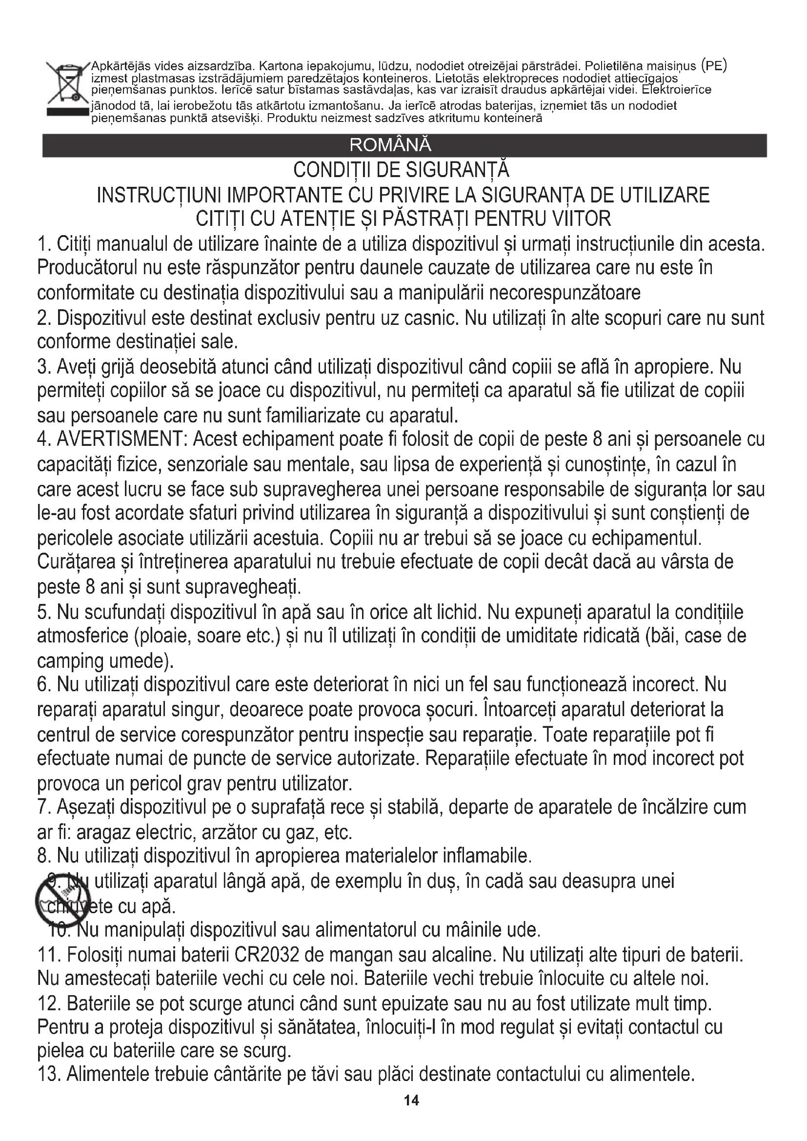 11. Folosiți numai baterii CR2032 de mangan sau alcaline. Nu utilizați alte tipuri de baterii.