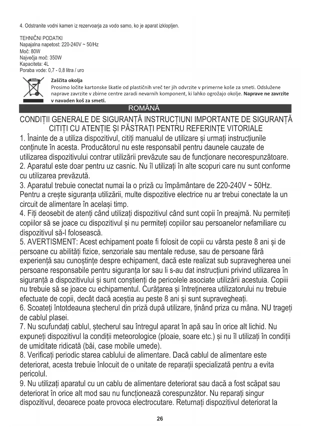 BOSANSKI Din grija pentru mediul înconjurător. Ambalajele din carton vă rugăm să le transmiteţi şa centrele de maculatură. Sacii din polietilenă (PE) trebuie aruncate în recipientele pentru materialele plastice. Dispozitivul uzat trebuie transmis la punctul corespunzător de depozitare, deoarece componentele periculoase care se găsesc în dispozitiv pot fi foarte periculoase pentru mediul înconjurător. Dispozitivul electric trebuie transmis în aşa fel încât să se limiteze utilizarea lui repetată. Dacă în dispozitiv se găsesc baterii acestea trebuiesc scoase şi transmise către punctul de depozitare a acestora, separat. OPĆI USLOVI SIGURNOSTI VAŽNE SIGURNOSNE UPUTSTVA PAŽLJIVO PROČITAJTE I ZAČUVAJTE ZA BUDUĆE REFERENCE