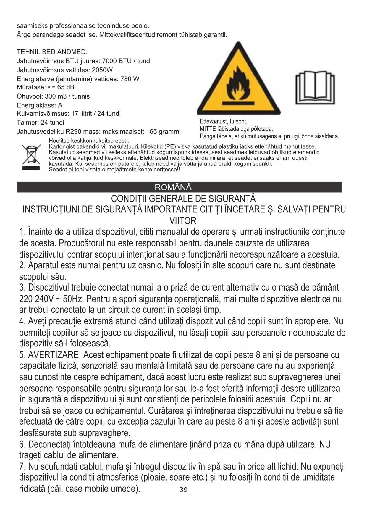 DEPANARE Problema I: Aerul condiționat nu funcționează. Motivul 1: Nu există energie electrică. Așadar, porniți-l după conectarea la o priză cu electricitate. Motivul 2: Lampa de control cu apă completă afișează „WF”. Deci, descărcați apa. Problema II .: Dispozitivul se repornește frecvent. Motivul1: lumina directă a soarelui. Deci, a tras perdelele. Motivul 2: Ușa și ferestrele sunt deschise, multe surse de căldură în cameră. Așadar, închideți ușa și ferestrele, extrageți sursele de căldură. Motivul 3: Filtrele sunt prea murdare. Deci, curățați sau înlocuiți filtrele. Motivul 4: Intrarea aerului sau ieșirea aerului este blocată. Deci, eliminați blocarea. Problema III: Zgomot mare Motiv: dispozitivul nu este plasat pe o suprafață plană. Așadar, puneți dispozitivul pe un loc plat și greu pentru a reduce zgomotul. Problema IV: Compresorul nu funcționează. Motiv: Protecția cu întârziere în timp a compresorului este activată. Deci, așteptați 3 minute până când temperatura este scăzută, apoi reporniți mașina. Notă: atunci când au apărut situații anormale, opriți mașina și scoateți priza, apoi contactați serviciul profesional pentru ajutor. Nu reparați singur dispozitivul. O reparație necalificată va anula garanția. DATE TEHNICE: Capacitate de răcire la BTU: 7000 BTU / oră Capacitate de răcire în wați: 2050W Consumul de energie (răcire) în wați: 780 W Nivel de zgomot: <= 65dB Debit de aer: 300 m3 / oră Clasa energetică: A Capacitate de uscare: 17 litri / 24 ore Cronometru: 24 de ore Greutatea lichidului de răcire R290: maxim 165 grame Din grija pentru mediul înconjurător. Ambalajele din carton vă rugăm să le transmiteţi şa centrele de maculatură. Sacii din polietilenă (PE) trebuie aruncate în recipientele pentru materialele plastice. Dispozitivul uzat trebuie transmis la punctul corespunzător de depozitare, deoarece componentele periculoase care se găsesc în dispozitiv pot fi foarte periculoase pentru mediul înconjurător. Dispozitivul electric trebuie transmis în aşa fel încât să se limiteze utilizarea lui repetată. Dacă în dispozitiv se găsesc baterii acestea trebuiesc scoase şi transmise către punctul de depozitare a acestora, separat. BOSANSKI