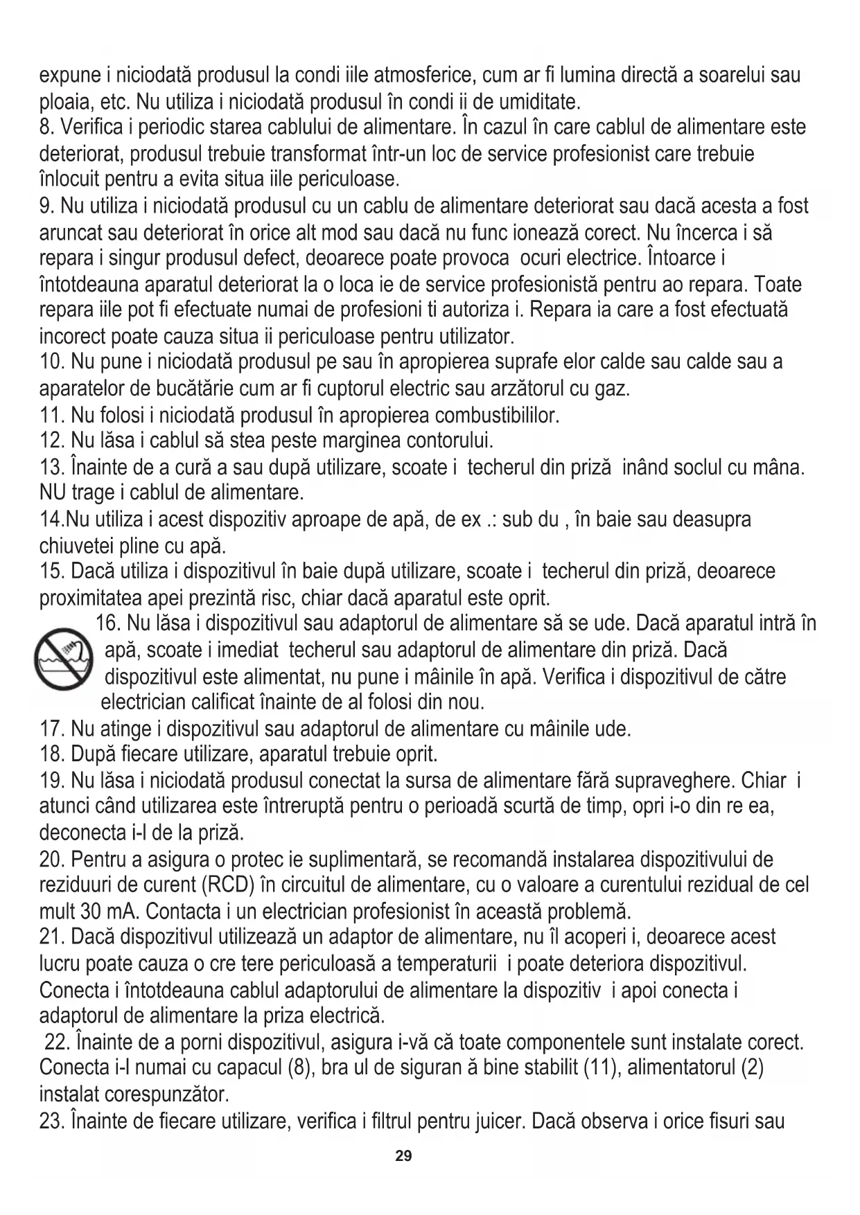 9. Nu utiliza i niciodată produsul cu un cablu de alimentare deteriorat sau dacă acesta a fost