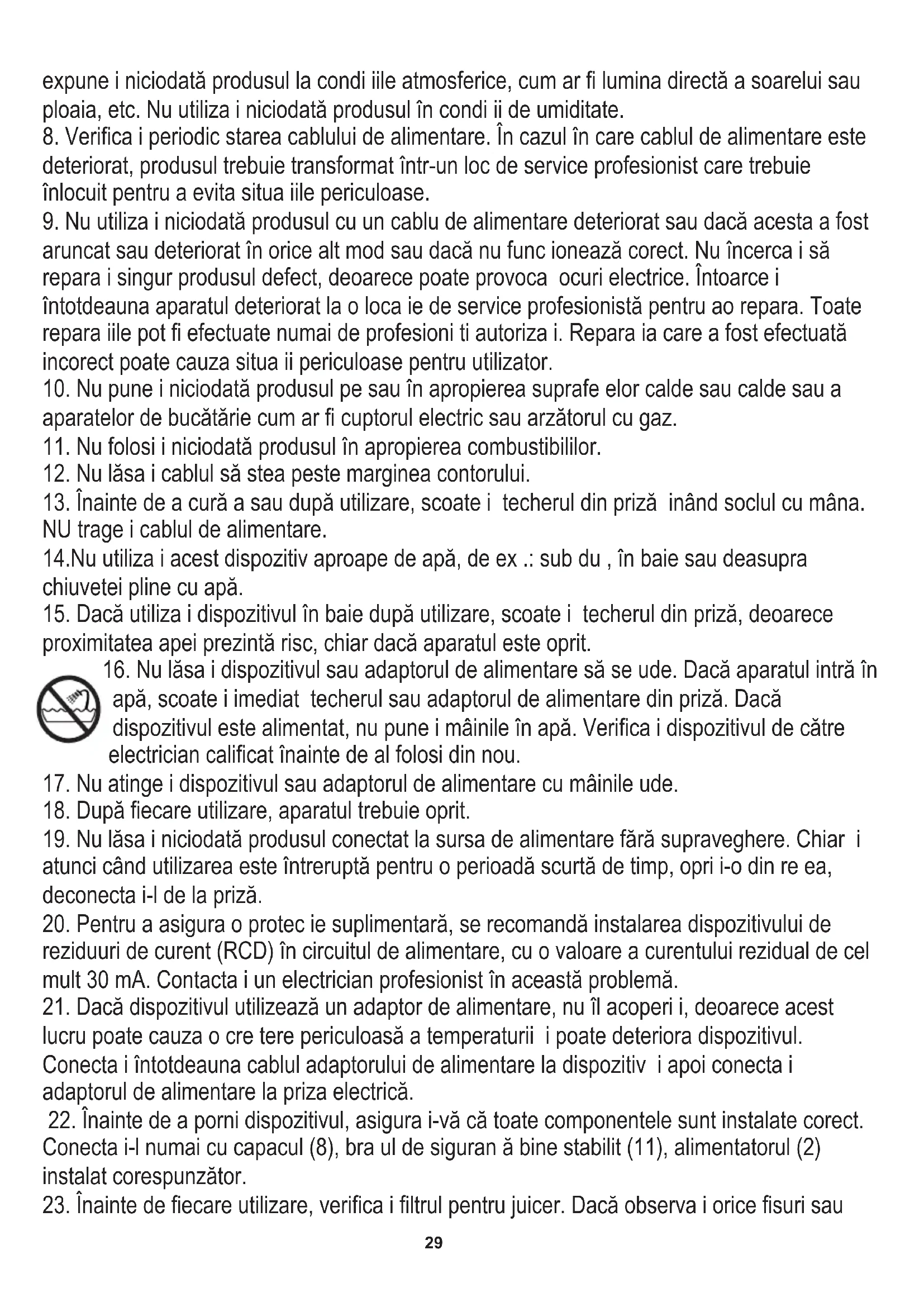 NU trage i cablul de alimentare. 14.Nu utiliza i acest dispozitiv aproape de apă, de ex .: sub du , în baie sau deasupra chiuvetei pline cu apă.