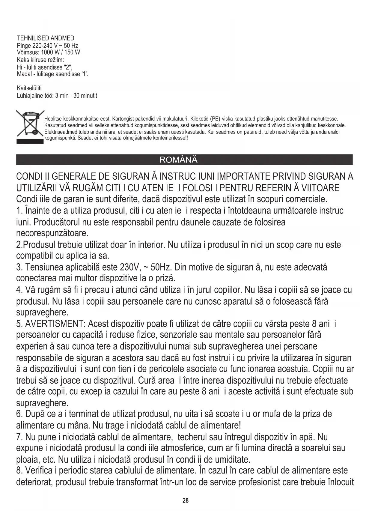 7. Decolorarea plasticului poate avea loc cu fructe i legume puternic colorate. Pentru a preveni acest lucru, spăla i imediat componentele după utilizare. 8. Dacă apare decolorare, piesele din plastic pot fi înmuiate în 10% suc de lămâie i apă sau pot fi cură ate cu un detergent neabraziv. Pentru a ajuta la cură are, înmoaie i co ul de filtru din o el inoxidabil (9) în apă caldă cu săpun timp de aproximativ 10 minute imediat după finalizarea procesului de stoarcere. Dacă pulpa este lăsată să se usuce pe filtru, aceasta poate bloca porii fini ai ochiului de plasă, reducând astfel eficacitatea juicerului. Pentru confortul dvs., o perie de cură at nylon a fost inclusă împreună cu produsul dvs. de juicer. DATE TEHNICE Tensiune: 220-240 V ~ 50 Hz Putere: 1000 W / 150 W Mod de două viteze: Hi-switch în pozi ia "2", Comutator joasă în pozi ia "1". Întrerupător de siguran ă Operatiune pe termen scurt: 3min - oprire 30 minute Din grija pentru mediul înconjurător. Ambalajele din carton vă rugăm să le transmiteţi şa centrele de maculatură. Sacii din polietilenă (PE) trebuie aruncate în recipientele pentru materialele plastice. Dispozitivul uzat trebuie transmis la punctul corespunzător de depozitare, deoarece componentele periculoase care se găsesc în dispozitiv pot fi foarte periculoase pentru mediul înconjurător. Dispozitivul electric trebuie transmis în aşa fel încât să se limiteze utilizarea lui repetată. Dacă în dispozitiv se găsesc baterii acestea trebuiesc scoase şi transmise către punctul de depozitare a acestora, separat. BOSANSKI OPŠTI SIGURNOSNI USLOVI ZNAČAJNI UPUTSTVO ZA BEZBEDNOST UPORABE PROČITAJTE PAŽLJIVO I ZAŠTITAJU BUDUĆU REFERENCIJU Uslovi garancije su različiti, ako se uređaj koristi u komercijalne svrhe.