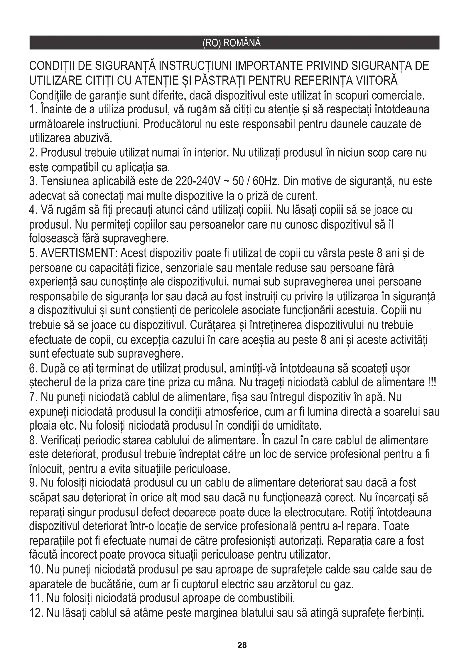 12. Nu lăsați cablul să atârne peste marginea blatului sau să atingă suprafețe fierbinți.