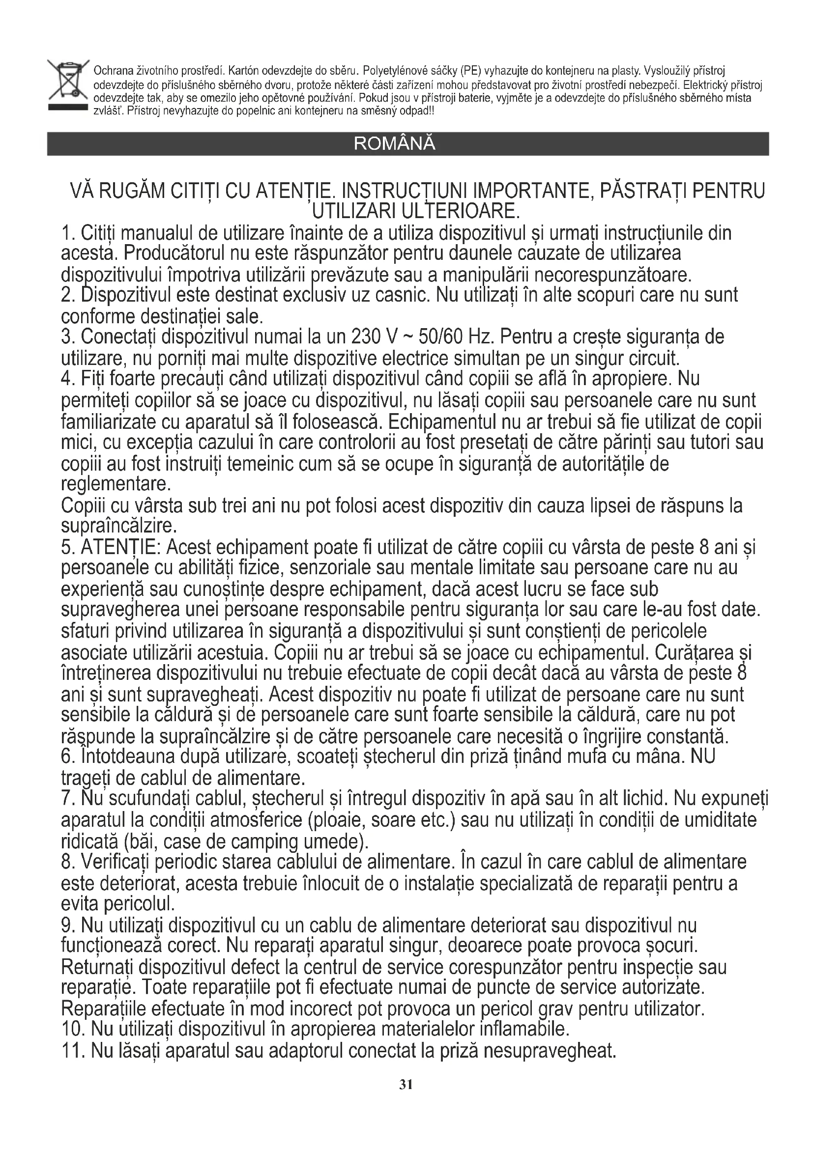 Ochrana životního prostředí. Kartón odevzdejte do sběru. Polyetylénové sáčky (PE) vyhazujte do kontejneru na plasty. Vysloužilý přístroj odevzdejte do příslušného sběrného dvoru, protože některé části zařízení mohou představovat pro životní prostředí nebezpečí. Elektrický přístroj odevzdejte tak, aby se omezilo jeho opětovné používání. Pokud jsou v přístroji baterie, vyjměte je a odevzdejte do příslušného sběrného místa zvlášť. Přístroj nevyhazujte do popelnic ani kontejneru na směsný odpad!! 3112. Pentru a asigura o protecție suplimentară, este recomandabil să instalați un dispozitiv de curent rezidual (RCD) cu un curent rezidual nominal care să nu depășească 30 mA în circuitul electric. În acest sens, vă rugăm să contactați un electrician.