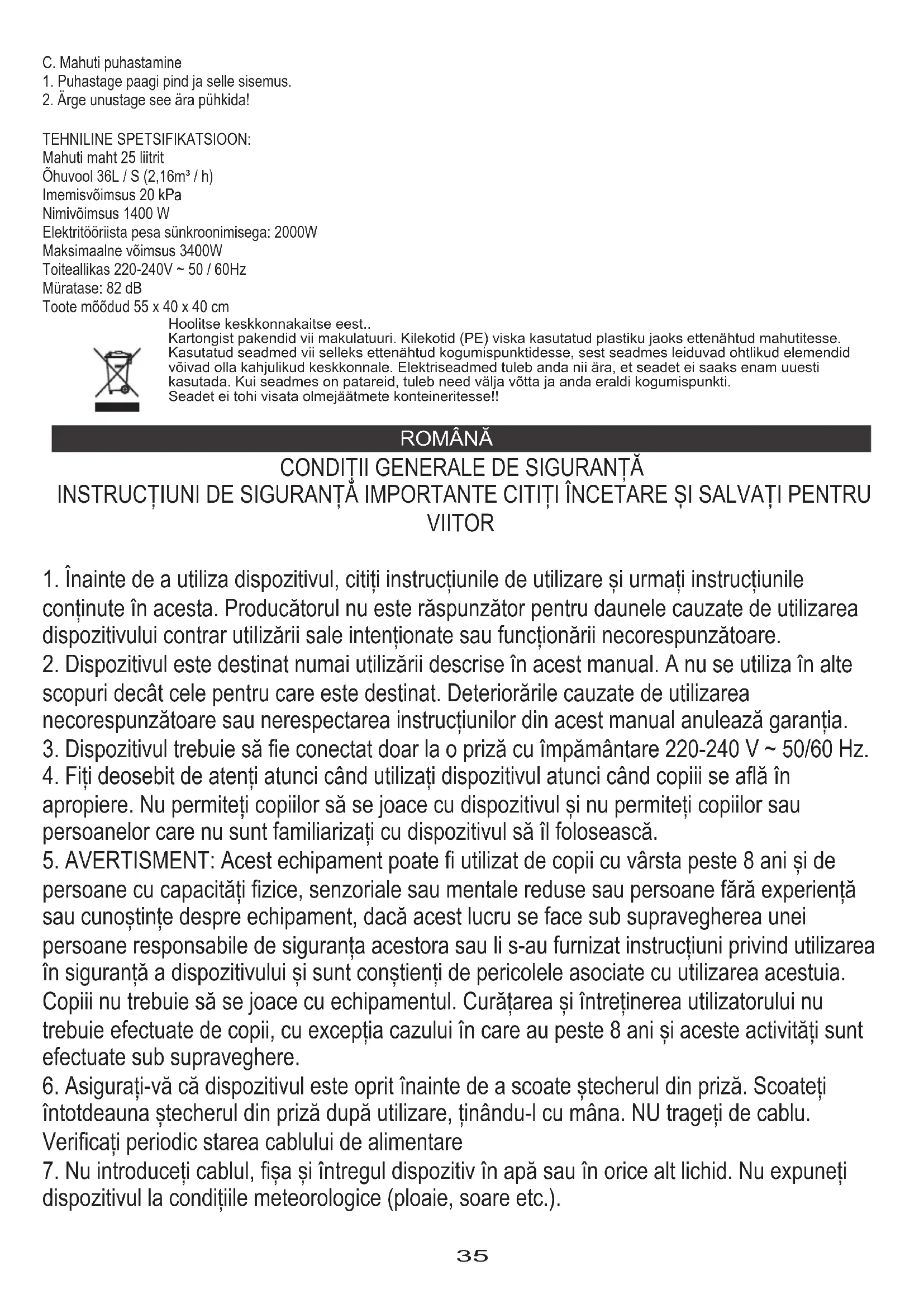SPECIFICAȚIE TEHNICĂ: Capacitate rezervor 25 litri Debit de aer 36L / S (2.16m³ / h) Puterea de aspirație 20 kPa Putere nominală 1400 W Priză sculă electrică cu sincronizare: 2000W Putere maximă 3400W Alimentare 220-240V ~ 50 / 60Hz Nivel de zgomot: 82 dB Dimensiuni produs 55 x 40 x 40 cm Din grija pentru mediul înconjurător. Ambalajele din carton vă rugăm să le transmiteţi şa centrele de maculatură. Sacii din polietilenă (PE) trebuie aruncate în recipientele pentru materialele plastice. Dispozitivul uzat trebuie transmis la punctul corespunzător de depozitare, deoarece componentele periculoase care se găsesc în dispozitiv pot fi foarte periculoase pentru mediul înconjurător. Dispozitivul electric trebuie transmis în aşa fel încât să se limiteze utilizarea lui repetată. Dacă în dispozitiv se găsesc baterii acestea trebuiesc scoase şi transmise către punctul de depozitare a acestora, separat. BOSANSKI