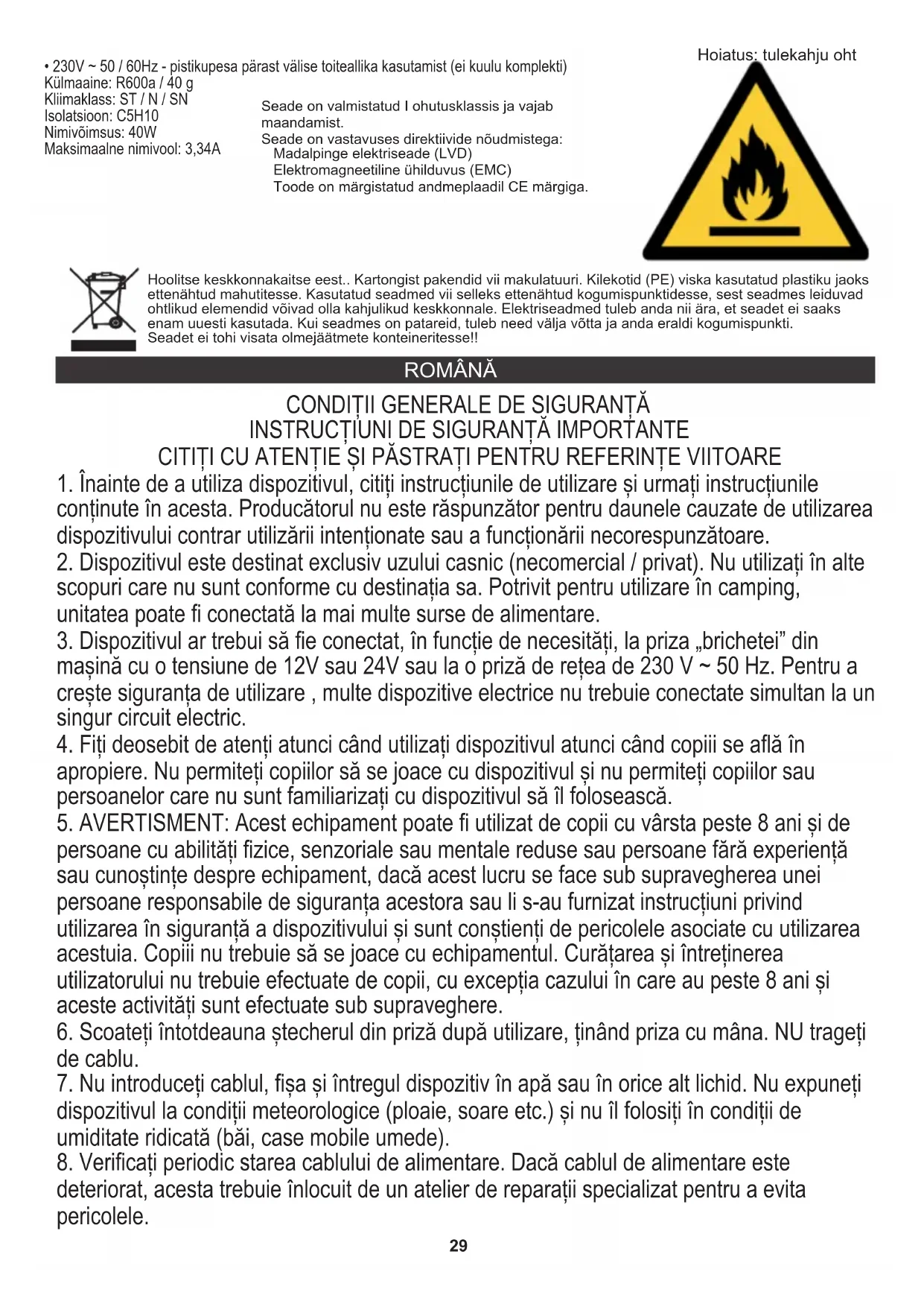 mașină cu o tensiune de 12V sau 24V sau la o priză de rețea de 230 V ~ 50 Hz. Pentru a crește siguranța de utilizare , multe dispozitive electrice nu trebuie conectate simultan la un singur circuit electric.