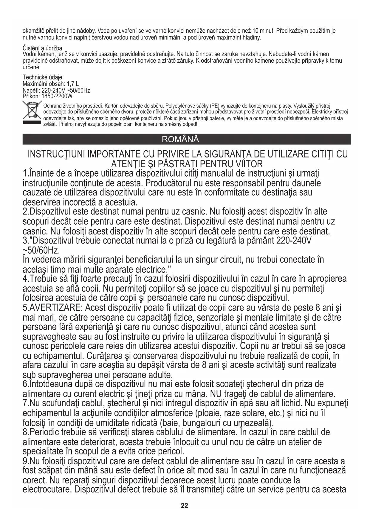 ROMÂNĂ 7.Nu scufundaţi cablul, ştecherul şi nici întregul dispozitiv în apă sau alt lichid. Nu expuneţi echipamentul la acţiunile condiţiilor atmosferice (ploaie, raze solare, etc.) şi nici nu îl folosiţi în condiţii de umiditate ridicată (baie, bungalouri cu umezeală). 9.Nu folosiţi dispozitivul care are defect cablul de alimentare sau în cazul în care acesta a fost scăpat din mână sau este defect în orice alt mod sau în cazul în care nu funcţionează corect. Nu reparaţi singuri dispozitivul deoarece acest lucru poate conduce la electrocutare. Dispozitivul defect trebuie să îl transmiteţi către un service pentru ca acesta 2.Dispozitivul este destinat numai pentru uz casnic. Nu folosiţi acest dispozitiv în alte scopuri decât cele pentru care este destinat. Dispozitivul este destinat numai pentru uz casnic. Nu folosiţi acest dispozitiv în alte scopuri decât cele pentru care este destinat. ~50/60Hz. 4.Trebuie să fiţi foarte precauţi în cazul folosirii dispozitivului în cazul în care în apropierea acestuia se află copii. Nu permiteţi copiilor să se joace cu dispozitivul şi nu permiteţi folosirea acestuia de către copii şi persoanele care nu cunosc dispozitivul. 5.AVERTIZARE: Acest dispozitiv poate fi utilizat de copii care au vârsta de peste 8 ani şi mai mari, de către persoane cu capacităţi fizice, senzoriale şi mentale limitate şi de către persoane fără experienţă şi care nu cunosc dispozitivul, atunci când acestea sunt supravegheate sau au fost instruite cu privire la utilizarea dispozitivului în siguranţă şi cunosc pericolele care reies din utilizarea acestui dispozitiv. Copii nu ar trebui să se joace cu echipamentul. Curăţarea şi conservarea dispozitivului nu trebuie realizată de copii, în afara cazului în care aceştia au depăşit vârsta de 8 ani şi aceste activităţi sunt realizate sub supravegherea unei persoane adulte. 6.Întotdeauna după ce dispozitivul nu mai este folosit scoateţi ştecherul din priza de alimentare cu curent electric şi ţineţi priza cu mâna. NU trageţi de cablul de alimentare. 8.Periodic trebuie să verificaţi starea cablului de alimentare. În cazul în care cablul de alimentare este deteriorat, acesta trebuie înlocuit cu unul nou de către un atelier de specialitate în scopul de a evita orice pericol. 3."Dispozitivul trebuie conectat numai la o priză cu legătură la pământ 220-240V În vederea măririi siguranţei beneficiarului la un singur circuit, nu trebui conectate în acelaşi timp mai multe aparate electrice." INSTRUCŢIUNI IMPORTANTE CU PRIVIRE LA SIGURANŢA DE UTILIZARE CITIŢI CU ATENŢIE ŞI PĂSTRAŢI PENTRU VIITOR 1.Înainte de a începe utilizarea dispozitivului citiţi manualul de instrucţiuni şi urmaţi instrucţiunile conţinute de acesta. Producătorul nu este responsabil pentru daunele cauzate de utilizarea dispozitivului care nu este în conformitate cu destinaţia sau deservirea incorectă a acestuia. okamžitě přelít do jiné nádoby. Voda po uvaření se ve varné konvici nemůže nacházet déle než 10 minut. Před každým použitím je nutné varnou konvici naplnit čerstvou vodou nad úroveň minimální a pod úroveň maximální hladiny. Technické údaje: Příkon: 1850-2200W Vodní kámen, jenž se v konvici usazuje, pravidelně odstraňujte. Na tuto činnost se záruka nevztahuje. Nebudete-li vodní kámen pravidelně odstraňovat, může dojít k poškození konvice a ztrátě záruky. K odstraňování vodního kamene používejte přípravky k tomu určené. Maximální obsah: 1,7 L Napětí: 220-240V ~50/60Hz Čistění a údržba Ochrana životního prostředí. Kartón odevzdejte do sběru. Polyetylénové sáčky (PE) vyhazujte do kontejneru na plasty. Vysloužilý přístroj odevzdejte do příslušného sběrného dvoru, protože některé části zařízení mohou představovat pro životní prostředí nebezpečí. Elektrický přístroj odevzdejte tak, aby se omezilo jeho opětovné používání. Pokud jsou v přístroji baterie, vyjměte je a odevzdejte do příslušného sběrného místa zvlášť. Přístroj nevyhazujte do popelnic ani kontejneru na směsný odpad!!23 11.Nu folosiţi dispozitivul în apropierea materialelor combustibile. 14.Pentru a asigura o protecţie suplimentară, se recomandă instalarea pe circuitul electric a unui dispozitiv cu curent diferenţial (RCD) cu curent alternativ diferenţial care nu va depăşi 30 mA. În acest sens trebuie să vă adresaţi unui electrician specialist.