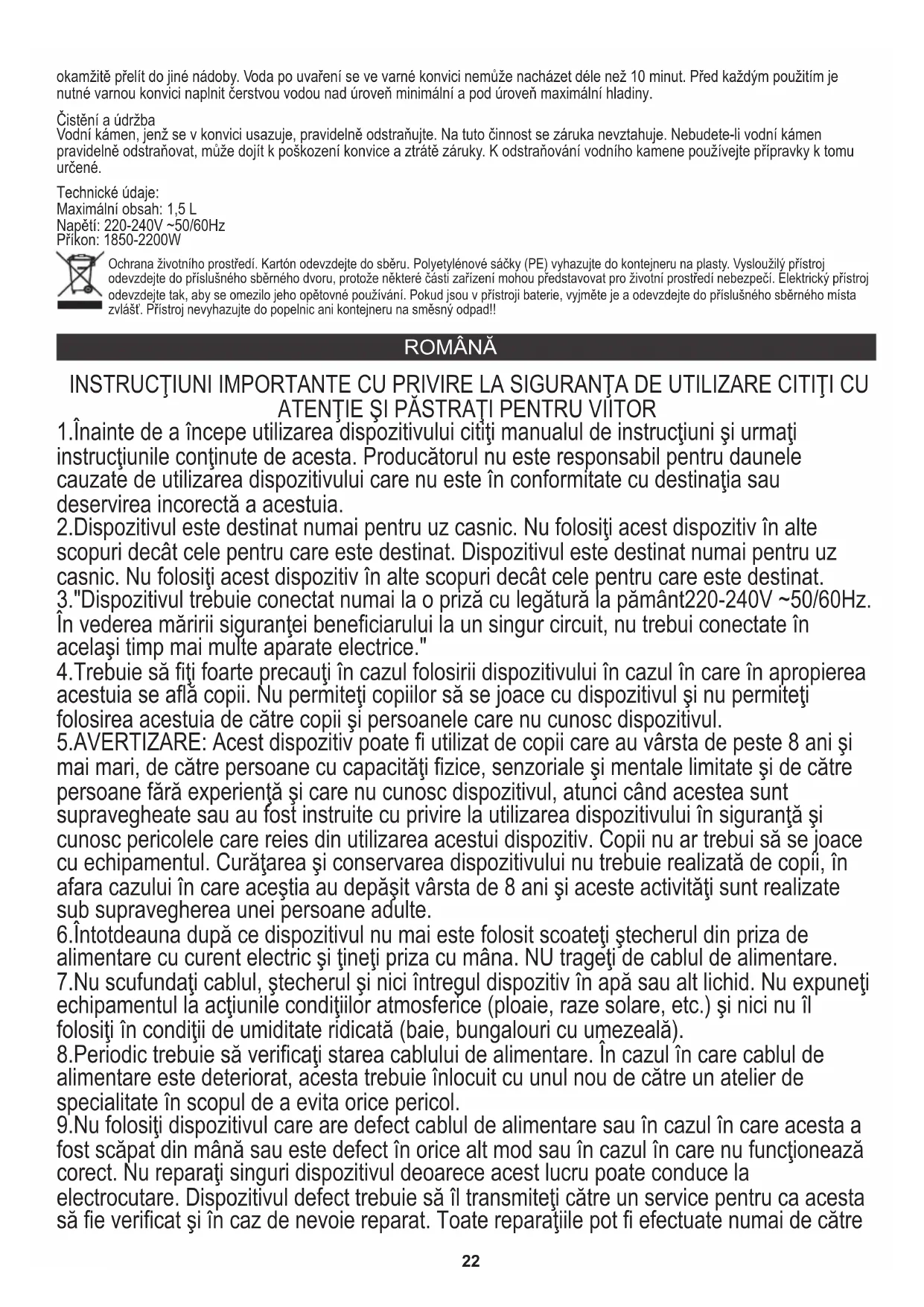 vybavení např.: sociálních místností pro zaměstnance v obchodech, kancelářích nebo na jiných pracovištích, hotelových a motelových pokojů nebo jiných ubytovacích objektů tohoto typu, místností sloužících ke spaní nebo k podávání snídaně.22 ROMÂNĂ 5.AVERTIZARE: Acest dispozitiv poate fi utilizat de copii care au vârsta de peste 8 ani şi mai mari, de către persoane cu capacităţi fizice, senzoriale şi mentale limitate şi de către persoane fără experienţă şi care nu cunosc dispozitivul, atunci când acestea sunt supravegheate sau au fost instruite cu privire la utilizarea dispozitivului în siguranţă şi cunosc pericolele care reies din utilizarea acestui dispozitiv. Copii nu ar trebui să se joace cu echipamentul. Curăţarea şi conservarea dispozitivului nu trebuie realizată de copii, în afara cazului în care aceştia au depăşit vârsta de 8 ani şi aceste activităţi sunt realizate sub supravegherea unei persoane adulte. 4.Trebuie să fiţi foarte precauţi în cazul folosirii dispozitivului în cazul în care în apropierea acestuia se află copii. Nu permiteţi copiilor să se joace cu dispozitivul şi nu permiteţi folosirea acestuia de către copii şi persoanele care nu cunosc dispozitivul. 6.Întotdeauna după ce dispozitivul nu mai este folosit scoateţi ştecherul din priza de alimentare cu curent electric şi ţineţi priza cu mâna. NU trageţi de cablul de alimentare. 7.Nu scufundaţi cablul, ştecherul şi nici întregul dispozitiv în apă sau alt lichid. Nu expuneţi echipamentul la acţiunile condiţiilor atmosferice (ploaie, raze solare, etc.) şi nici nu îl folosiţi în condiţii de umiditate ridicată (baie, bungalouri cu umezeală). În vederea măririi siguranţei beneficiarului la un singur circuit, nu trebui conectate în acelaşi timp mai multe aparate electrice." 9.Nu folosiţi dispozitivul care are defect cablul de alimentare sau în cazul în care acesta a fost scăpat din mână sau este defect în orice alt mod sau în cazul în care nu funcţionează corect. Nu reparaţi singuri dispozitivul deoarece acest lucru poate conduce la electrocutare. Dispozitivul defect trebuie să îl transmiteţi către un service pentru ca acesta să fie verificat şi în caz de nevoie reparat. Toate reparaţiile pot fi efectuate numai de către 3."Dispozitivul trebuie conectat numai la o priză cu legătură la pământ220-240V ~50/60Hz. 1.Înainte de a începe utilizarea dispozitivului citiţi manualul de instrucţiuni şi urmaţi instrucţiunile conţinute de acesta. Producătorul nu este responsabil pentru daunele cauzate de utilizarea dispozitivului care nu este în conformitate cu destinaţia sau deservirea incorectă a acestuia. 2.Dispozitivul este destinat numai pentru uz casnic. Nu folosiţi acest dispozitiv în alte scopuri decât cele pentru care este destinat. Dispozitivul este destinat numai pentru uz casnic. Nu folosiţi acest dispozitiv în alte scopuri decât cele pentru care este destinat. 8.Periodic trebuie să verificaţi starea cablului de alimentare. În cazul în care cablul de alimentare este deteriorat, acesta trebuie înlocuit cu unul nou de către un atelier de specialitate în scopul de a evita orice pericol. INSTRUCŢIUNI IMPORTANTE CU PRIVIRE LA SIGURANŢA DE UTILIZARE CITIŢI CU ATENŢIE ŞI PĂSTRAŢI PENTRU VIITOR Čistění a údržba Vodní kámen, jenž se v konvici usazuje, pravidelně odstraňujte. Na tuto činnost se záruka nevztahuje. Nebudete-li vodní kámen pravidelně odstraňovat, může dojít k poškození konvice a ztrátě záruky. K odstraňování vodního kamene používejte přípravky k tomu určené. okamžitě přelít do jiné nádoby. Voda po uvaření se ve varné konvici nemůže nacházet déle než 10 minut. Před každým použitím je nutné varnou konvici naplnit čerstvou vodou nad úroveň minimální a pod úroveň maximální hladiny. Technické údaje: Maximální obsah: 1,5 L Příkon: 1850-2200W Napětí: 220-240V ~50/60Hz Ochrana životního prostředí. Kartón odevzdejte do sběru. Polyetylénové sáčky (PE) vyhazujte do kontejneru na plasty. Vysloužilý přístroj odevzdejte do příslušného sběrného dvoru, protože některé části zařízení mohou představovat pro životní prostředí nebezpečí. Elektrický přístroj odevzdejte tak, aby se omezilo jeho opětovné používání. Pokud jsou v přístroji baterie, vyjměte je a odevzdejte do příslušného sběrného místa zvlášť. Přístroj nevyhazujte do popelnic ani kontejneru na směsný odpad!!23