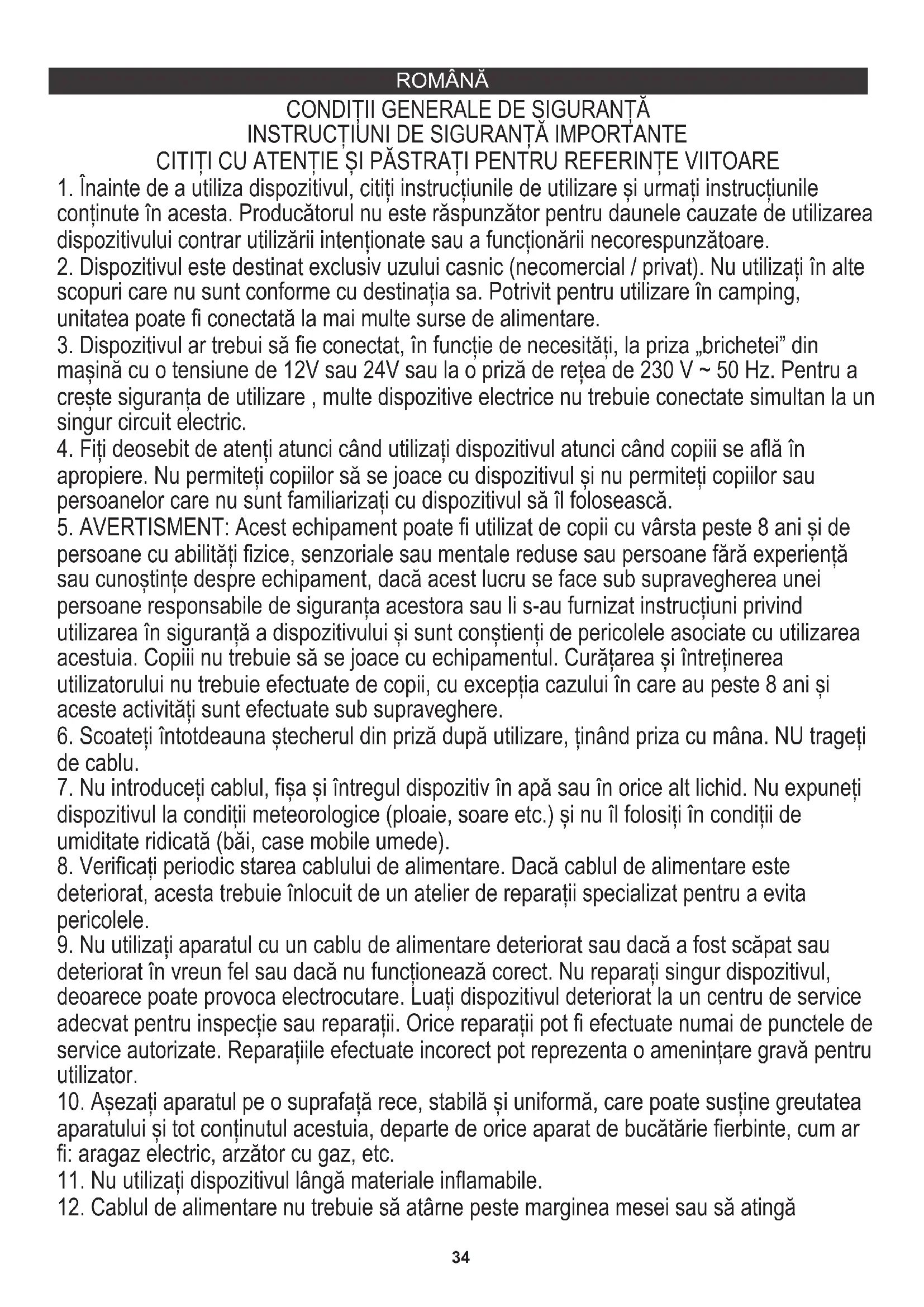 mașină cu o tensiune de 12V sau 24V sau la o priză de rețea de 230 V ~ 50 Hz. Pentru a crește siguranța de utilizare , multe dispozitive electrice nu trebuie conectate simultan la un singur circuit electric.